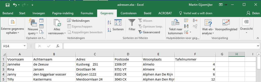 Het klinkt een beetje knullig, maar even pas op de plaats maken is één van de nuttigste stappen in deze workshop. Niets is vervelender dan alles in kannen en kruiken hebben, en daarna ontdekken dat je het Excel-document moet aanpassen omdat je nog iets bent vergeten. Denk na wat je in het Word-document wilt hebben. Ter illustratie sturen wij een uitnodiging voor een bruiloft. We hebben daarvoor ten eerste NAW-gegevens nodig voor de adressering en persoonlijke aanhef, maar willen ook graag tafelnummers toekennen voor het diner. Er komen tweehonderd gasten, dus je kunt je voorstellen dat dat handmatig een enorme klus zou zijn. Met een verzendlijst is dat zo gepiept.