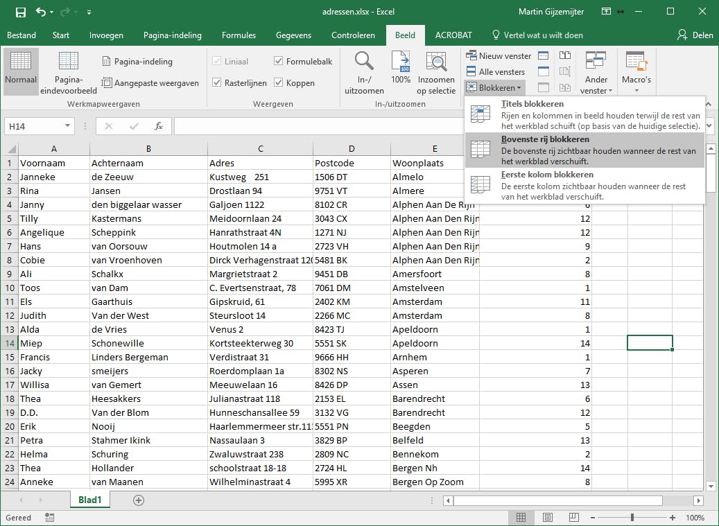 Nu kun je het Excel-document gaan invullen. In ons geval plaatsen we de volgende kopjes in de eerste regel van het document: Voornaam, Achternaam, Adres, Postcode, Woonplaats en Tafelnummer. Zodra je dit hebt gedaan, blokkeer je de bovenste rij in het document door te klikken op het tabblad Beeld in het lint en vervolgens op Blokkeren / Bovenste rij blokkeren. Dat is handig; zo kun je bij lange documenten zien in welke kolom je ook alweer werkt wanneer je naar beneden scrolt. Vervolgens vul je het document verder in: dus op elke regel van iedereen de informatie die bij de kopjes hoort (in ons geval dus voornaam, achternaam enzovoort). Wil je de documenten per mail versturen, dan is een kopje E-mailadres ook nodig.