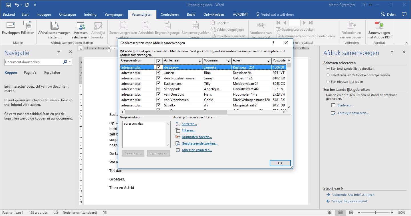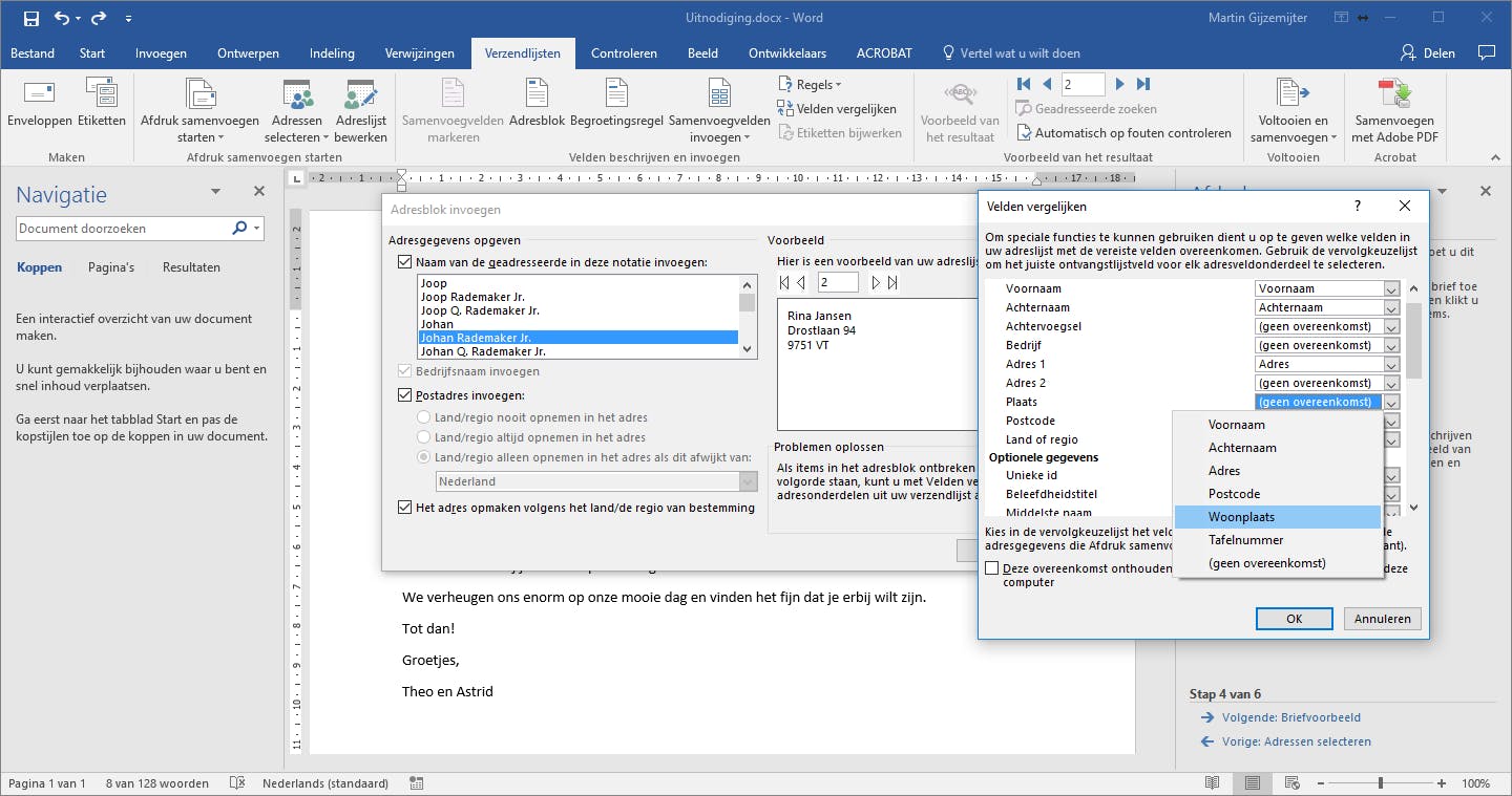 Je hebt nu je Word-document met succes gekoppeld aan de informatie in het Excel-document, en Word weet welke informatie waar ingevoegd moet worden. We snappen dat het best eng is om daarop te vertrouwen in het begin, maar gelukkig kun je het testen. Klik bovenin op Voorbeeld van het resultaat en je zult zien dat de ‘placeholders’ worden vervangen door de daadwerkelijke informatie. Naast de knop Voorbeeld van het resultaat zie je pijltjes naar links en rechts, waarmee je door de resultaten kunt scrollen om te kijken of alles klopt.