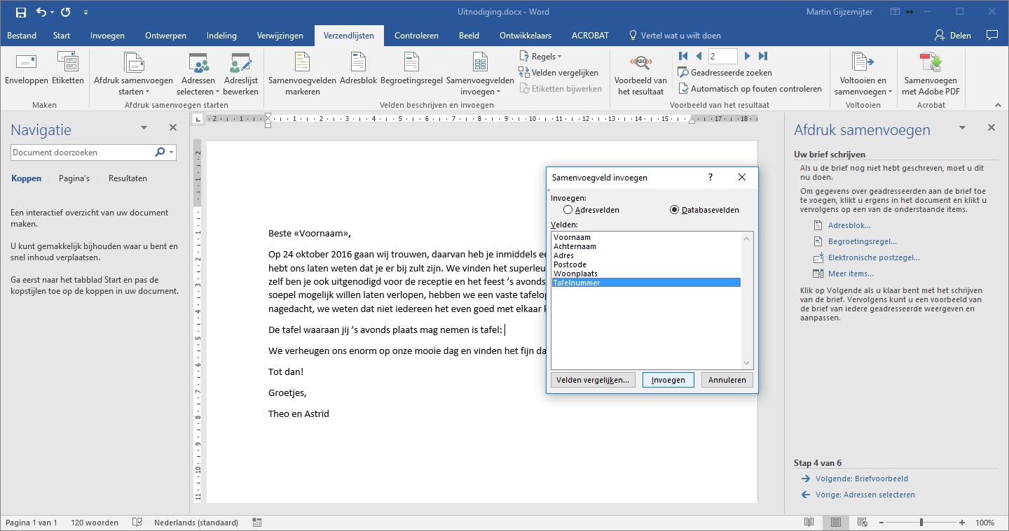 Naast het adres hebben we natuurlijk ook nog een aanhef en een tafelnummer. Deze voeg je op een gelijksoortige manier in. Selecteer de naam achter de aanhef en druk op de Delete-toets. Klik nu op Meer items in het rechterdeelvenster, selecteer Voornaam en klik op Invoegen. Om, in ons geval, het tafelnummer in te voegen, selecteren we het tafelnummer, drukken we op Delete en klikken we op Meer items / Tafelnummer / Invoegen.
