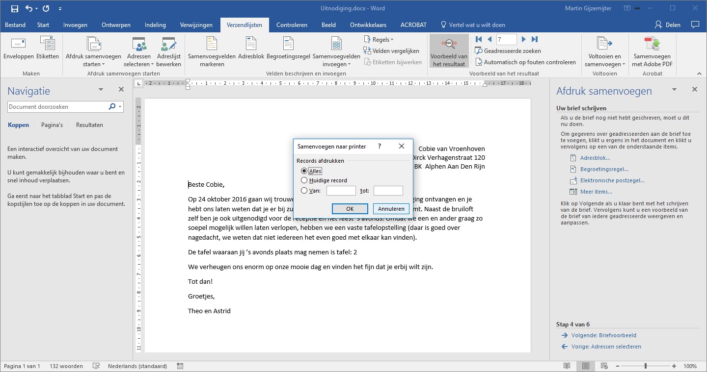 Alle informatie is ingevuld, maar hoe zorg je er nu voor dat dit bij de juiste mensen komt? Dat kan op twee manieren. De eerste manier is afdrukken. Wanneer je klikt op Voltooien en samenvoegen / Documenten afdrukken, dan verschijnt er een klein venster waarin je kunt aangeven of je alles wilt afdrukken of slechts een bepaald aantal (bijvoorbeeld 1 tot en met 50, als je om wat voor reden dan ook in etappes stuurt). De opdracht wordt naar je printer verstuurd en elke afdruk is voorzien van een andere naam en een ander adres. Naast efficiënt is dit overigens ook veel minder foutgevoelig.