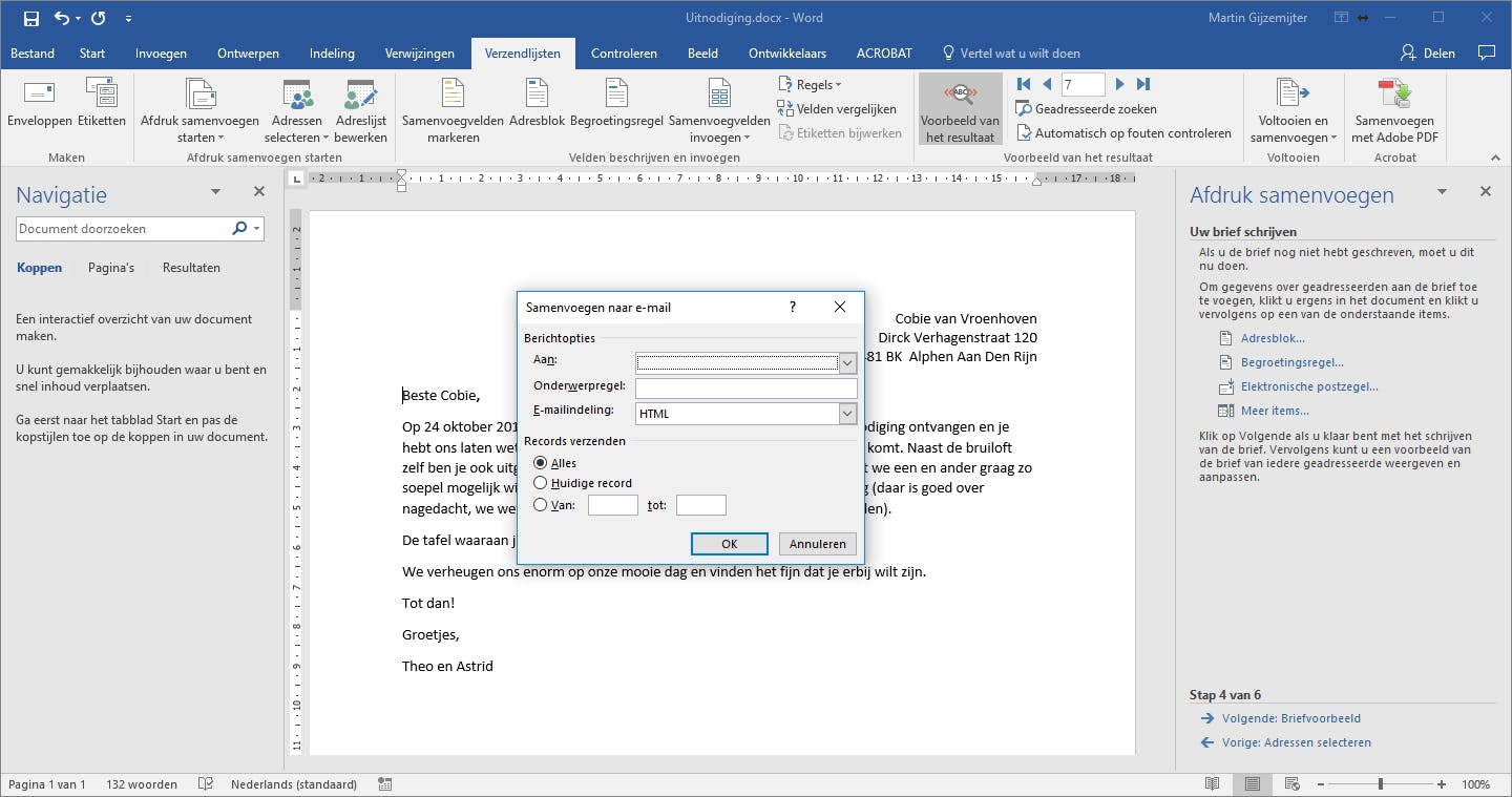 Digitaal verzenden kan natuurlijk ook, mits je Outlook hebt geïnstalleerd en een account hebt ingesteld. Klik op Voltooien en samenvoegen en vervolgens op E-mailberichten verzenden. In het venster dat verschijnt, selecteer je E-mailadres bij Aan en geef je vervolgens een onderwerpregel in. Ook hier kun je aangeven of je alles wilt versturen of slechts een deel. Zodra je klikt op OK, worden alle documenten als mail verstuurd via het account dat je hebt ingesteld in Outlook.