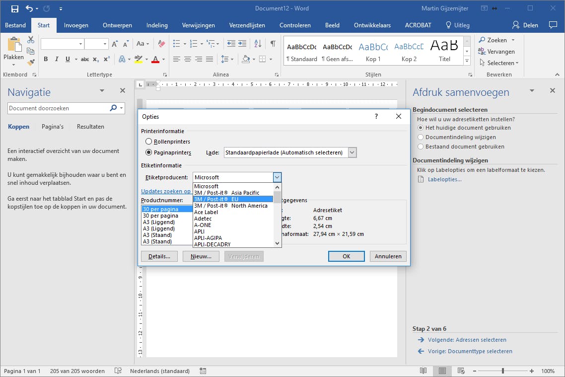 Kies je voor verzending per post, dan heb je natuurlijk ook etiketten nodig. Dan is het goed om te weten dat je enveloppen en etiketten op dezelfde manier kunt afdrukken. Maak een nieuw document en volg stap 6, 7 en 8. Ditmaal kies je echter in de eerste stap van de wizard voor Enveloppen of Etiketten. In stap 2 van de wizard klik je op Labelopties of Etiketopties om de afmeting te selecteren van de labels/etiketten die je in je printer hebt liggen. In stap 4 van de wizard klik je, na het invoegen van het adresblok op Alle labels bijwerken. Je kunt nu in één klap alle labels uitprinten zonder daar handmatig iets aan te hoeven doen.