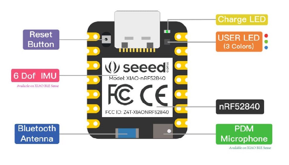 Voor bluetooth alleen hebben we geen ESP32-microcontrollerbordje of een Raspberry Pi Pico nodig, die immers ook een wifi-chip hebben en daardoor meer energie verbruiken. Daarom kiezen we voor een microcontrollerbordje gebaseerd op de nRF52840, een populaire bluetooth-chip van Nordic Semiconductor. Dit soort bordjes zijn energiezuinig en worden door talloze programmeeromgevingen ondersteund.