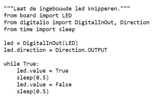In het grotere tekstveld bovenaan kun je nu je code typen die je op je bordje wilt uitvoeren. Om te testen of de hardware werkt, typ je daarin de volgende code die de ingebouwde led doet knipperen:
