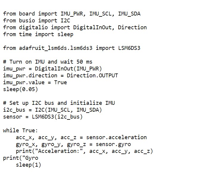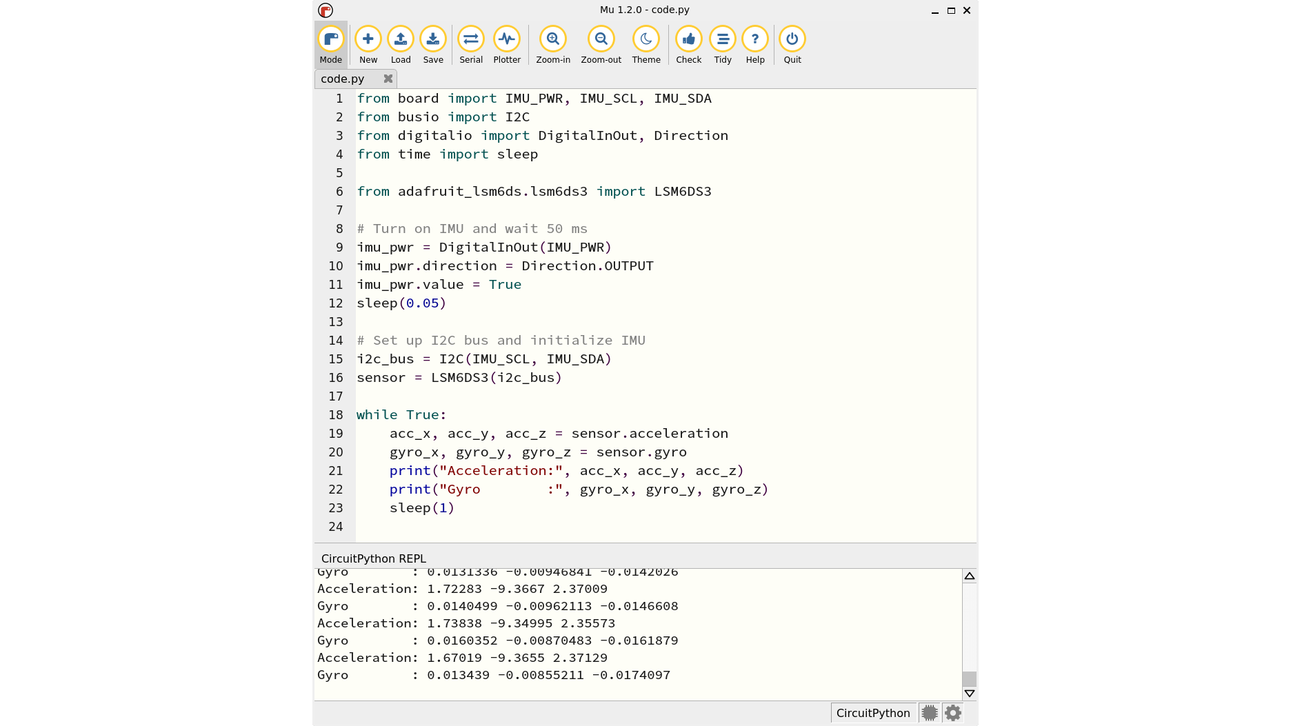 Deze code schakelt de IMU in, wacht 50 ms tot de sensor is ingeschakeld, stelt de I2C-bus in en initialiseert dan de IMU. Daarna lezen we elke seconde de versnelling en hoeksnelheid over de drie assen in en tonen deze. Sla je dit bestand op met Ctrl+S, dan krijg je in de REPL de sensorwaardes te zien. Als je wat zwaait met het bordje, zie je onmiddellijk het effect op de metingen.