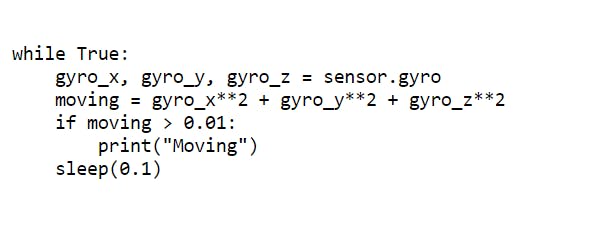 We verminderen het slaapinterval tot 100 ms om een snellere reactie te krijgen. Elke keer dat je nu het bordje beweegt, krijg je “Moving” te zien in de REPL. Pas indien nodig de drempelwaarde 0.01 aan.