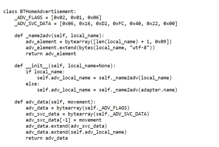 Je ziet hier dat we de elementen voor de flags en service data definiëren. In de methode __init__ (die een object van de klasse aanmaakt) zetten we de naam die je aan het object doorgeeft om naar een element voor de local name. Op het moment dat we de bewegingstoestand van de sensor willen adverteren, kunnen we dan eenvoudigweg de methode adv_data van het object roepen met als argument 1 voor beweging en 0 voor geen beweging. Die methode plakt al die reeksen bytes op de juiste manier aan elkaar en vervangt het laatste byte van de service data door de bewegingstoestand.