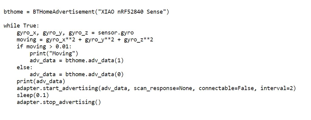 We maken dan op het einde van onze code een object van de klasse BTHomeAdvertisement met de naam van ons apparaat, en de while-lus breiden we uit om de bewegingstoestand telkens te adverteren: