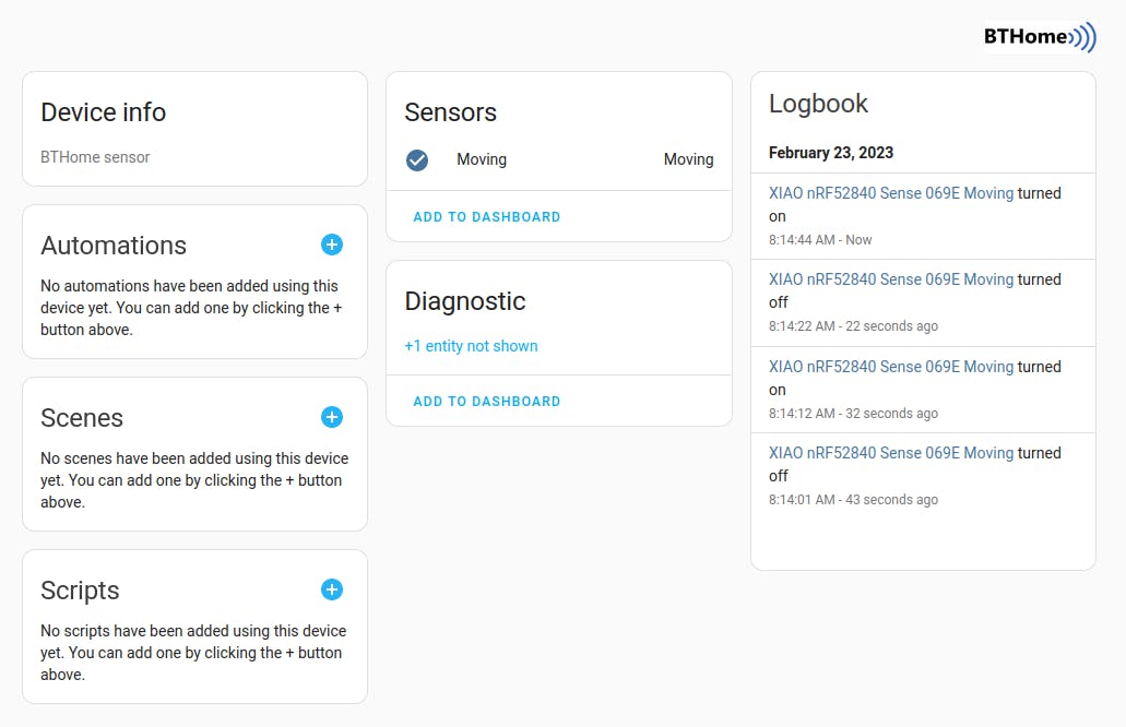 BTHome is ook een flexibel formaat: je kunt de data van meerdere sensors tegelijk in één advertentie uitsturen. Stel dat we op onze XIAO nRF52840 Sense na de beweging ook de temperatuur willen uitsturen, dan voegen we aan de service data gewoon 0x02 voor de temperatuur toe en dan twee bytes die de temperatuur in honderdsten van een graad Celsius voorstellen. En we kunnen er ook nog 0x01 voor het batterijpercentage aan toevoegen en dan een byte met een waarde van 0 tot 100. De BTHome-integratie van Home Assistant pikt al die types en bijbehorende data op. Als je dus ooit een eigen bluetooth-sensor wilt maken, probeer dan BTHome eens uit.