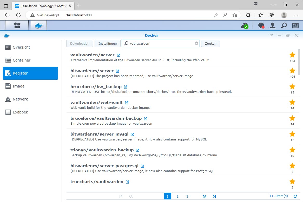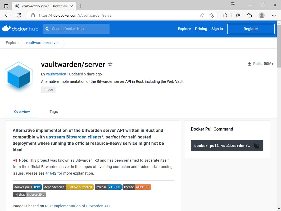 Om Vaultwarden te installeren, heb je uiteraard het juiste Docker-image nodig. Wij kiezen het standaardimage (vaultwarden/server). Datzelfde image ondersteunt het gebruik van SQLite, MySQL of PostgreSQL als database. Voorheen waren er verschillende images voor elk type database. Het advies is doorgaans om de standaardoptie SQLite te gebruiken, omdat deze het meest gebruikt en getest is. Verder worden meerdere architecturen ondersteund, waardoor je de container zowel op een x86-systeem als een ARM-systeem (zoals een Raspberry Pi) kunt opzetten.