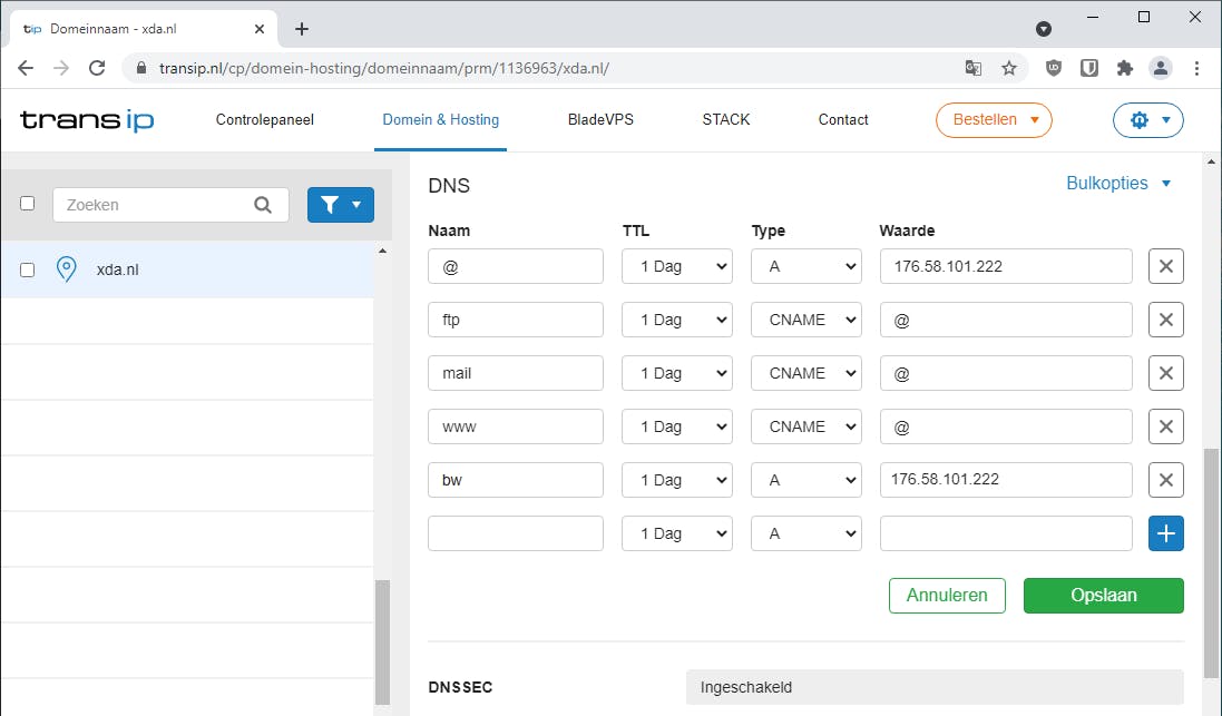 Om onze Bitwarden-server op afstand te kunnen benaderen, gaan we een subdomein gebruiken en enkele regels voor portforwarding instellen in de router. Hiervoor verwijs je het A-record van een subdomein naar het ip-adres van je internetverbinding thuis. Als je geen vast ip-adres hebt, zou je met dynamische DNS kunnen werken, zoals Duck DNS of No-IP.