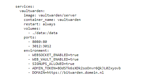 Vooral de opties onder environment zijn persoonlijk. Dit zijn de zogenoemde omgevingsvariabelen. Als je een reverse proxy gaat gebruiken, vul dan achter DOMAIN het https-adres in dat je voor Bitwarden gaat gebruiken. Op de host (het systeem waarop we Vaultwarden installeren) gebruiken we poort 8080, die we koppelen aan poort 80 binnen de container.