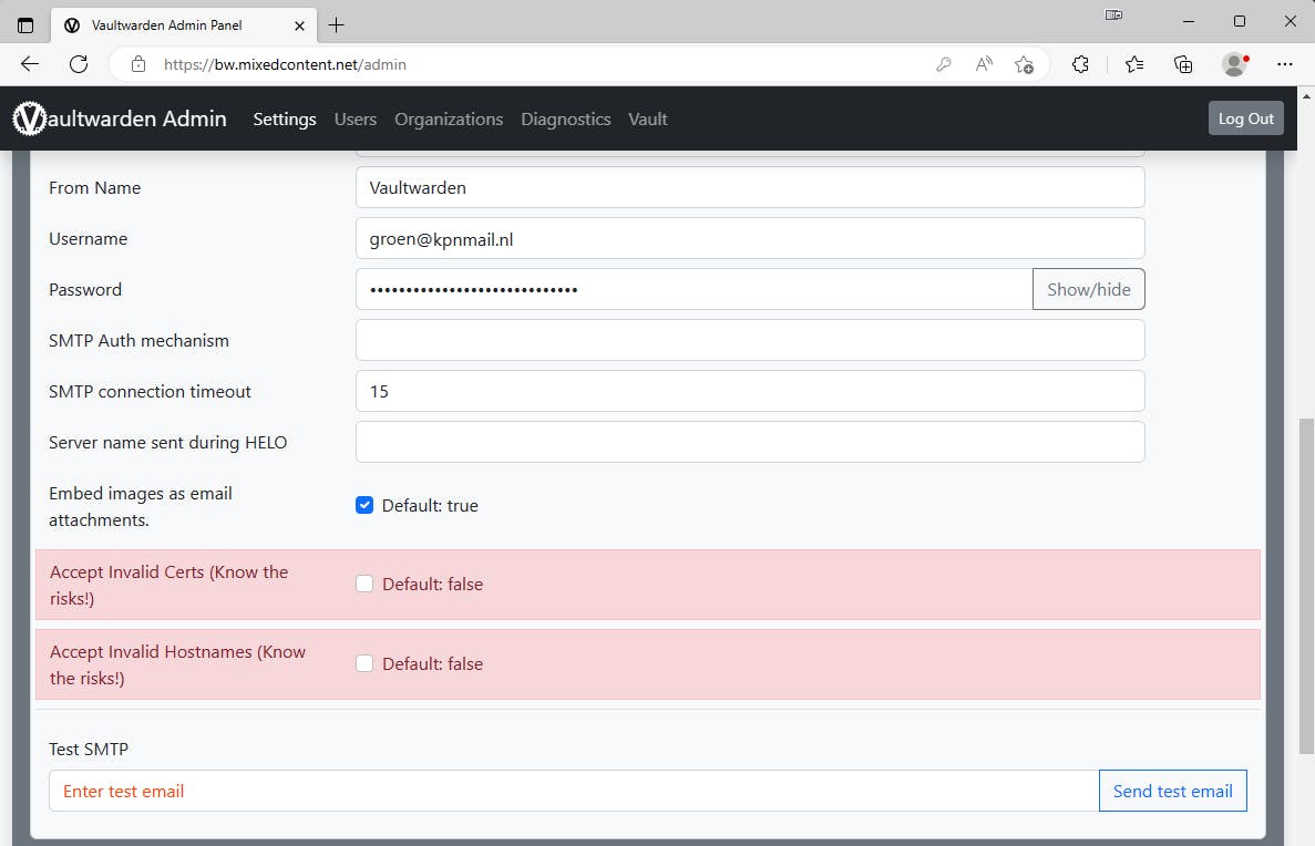 Bij sommige acties zal Vaultwarden een e-mail willen versturen. Denk aan bepaalde meldingen, maar ook verzoeken zoals het bevestigen van een e-mailadres. Daarom is het handig om via omgevingsvariabelen de correcte instellingen voor SMTP op te geven. Je kunt bijvoorbeeld die van je internetprovider gebruiken. Voor bijvoorbeeld KPN kun je de omgevingsvariabelen in het bestand docker-compose.yml aanvullen met onderstaande regels. Daarbij kun je bij SMTP_FROM overigens zelf een afzender invullen. Op de admin-pagina vind je op het tabblad Settings een handige optie om je SMTP-instellingen te testen. Het is overigens niet handig om de configuratie daar aan te passen (zie kader ‘Configuratie Vaultwarden’).