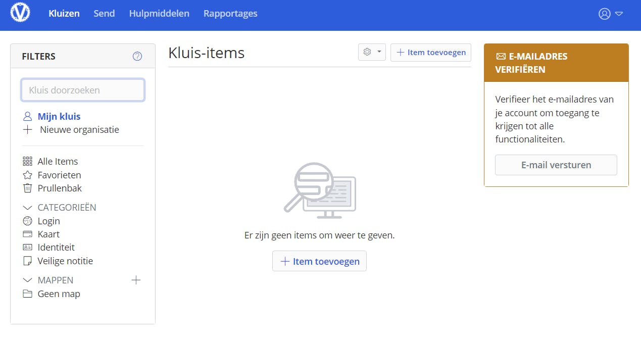 Je kunt in het vervolg de web vault via je domein benaderen, zoals https://bitwarden.domein.nl. Maak hier als eerste een nieuw account aan met uiteraard een sterk hoofdwachtwoord. Daarna kun je direct inloggen met deze gegevens. Via een knop stuur je een bericht waarmee je jouw e-mailadres bevestigt.