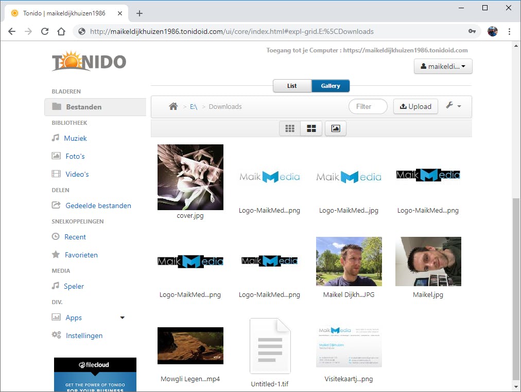 Nu heb je wereldwijd toegang tot je persoonlijke cloudomgeving. Je hebt hiervoor alleen een computer met toegang tot internet nodig. Open een willekeurige browser en surf naar het unieke webadres dat je van Tonido hebt gekregen (zie tip 02), bijvoorbeeld https://maikeldijkhuizen1986.tonidoid.com (gebruik altijd https). Nadat je het juiste wachtwoord hebt ingevuld, klik je op Aanmelden. Op deze manier log je in op de Tonido-server bij jou thuis. Alle mappen die je in de voorgaande tip hebt toegevoegd, verschijnen nu in de browser. Klik voor het terugvinden van bestanden in submappen telkens op de mapnaam. Standaard toont Tonido alle bestanden in een lijst, maar je kunt ze ook als miniaturen weergeven. Kies in dat geval bovenaan voor Gallery. Verder bevindt zich bovenaan een bestandspad. Hiermee navigeer je eenvoudig naar de voorgaande map. Onder dit bestandspad staan ook pictogrammen om de mapinhoud als kleine miniaturen, grote miniaturen of diavoorstelling te openen. Een diavoorstelling is handig voor wie meerdere foto’s op volledige grootte wil bekijken. Heeft een map nogal veel inhoud? Gebruik dan bovenaan de zoekfunctie om een specifiek bestand op te sporen. Klik op het Filter-veld en typ (een deel van) een trefwoord.