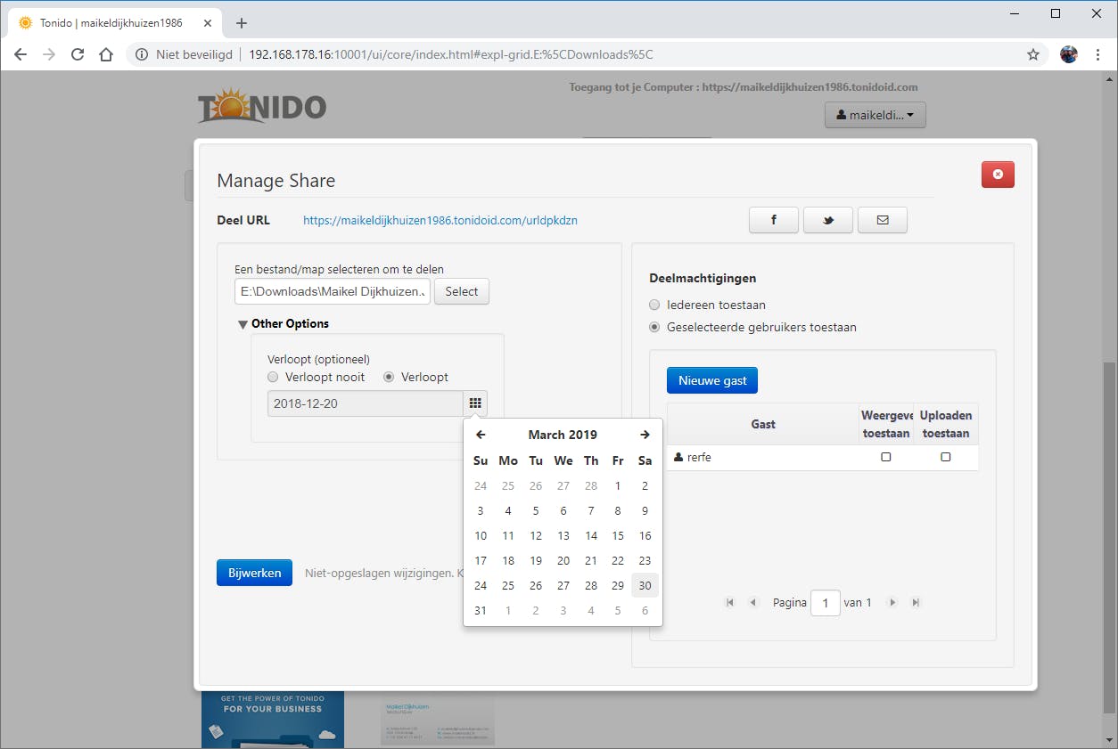 Tonido is ook een handig hulpmiddel wanneer je bestanden met anderen wilt delen. Zo verspreid je bijvoorbeeld een mooie vakantiefoto onder familie of stuur je een belangrijk document naar je boekhouder. Bedenk wel dat je slechts één bestand per keer kunt delen. Navigeer naar de juiste map en klik een bestand aan. In het compacte kader klik je vervolgens op Deel. Tonido genereert van het bestand een unieke url die je naar bekenden kunt sturen, bijvoorbeeld via e-mail of sociale media. Via de knop Geavanceerde opties zijn er nog meer mogelijkheden. Zo stel je onder meer een verloopdatum in en geef je alleen specifieke personen toegang tot het bestand. In het laatste geval creëer je via de knop Nieuwe gast een gastaccount. Tot slot deel je de url eventueel rechtstreeks via Facebook, Twitter of e-mail door rechtsboven op de overeenkomstige pictogrammen te klikken. Sla met Bijwerken en Close de wijzigingen op.