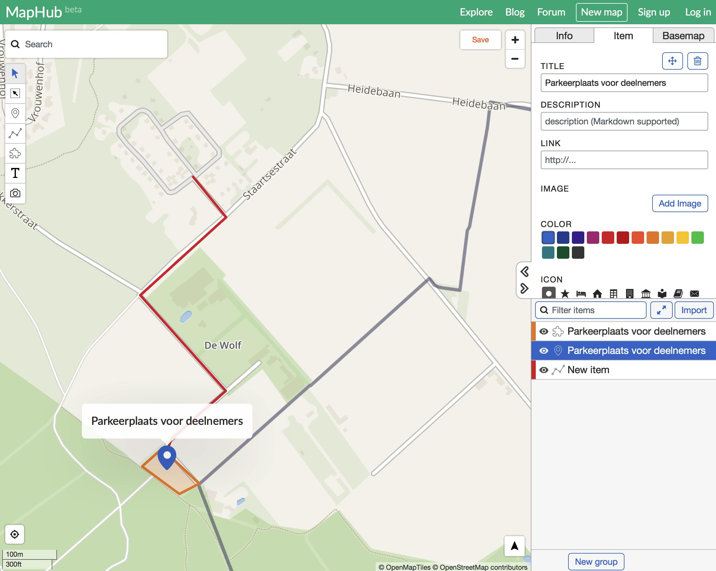De routes die je aanbrengt met het puzzelstuk-icoontje kun je later nog aanpassen en verplaatsen. Wanneer je tevreden bent over je kaart, klik je op Save. Je kunt de kaart privé of openbaar bewaren en met Share kun je je kaart downloaden in kml, gpx, geojson of jpg. Ook ontvang je een koppeling en een insluitcode om de kaart op je blog of website te publiceren.