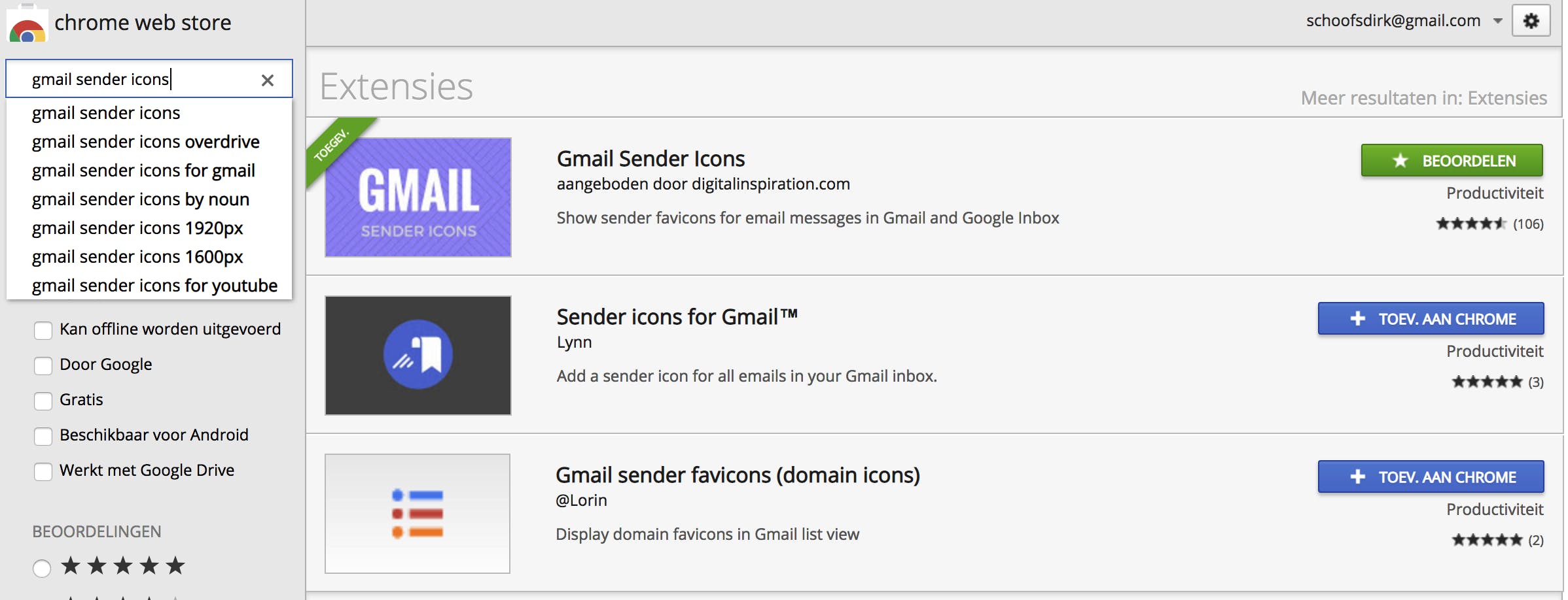 De standaard lay-out van de Gmail-inbox toont de naam van de afzender in de linkerkolom, gevolgd door het onderwerp en de datum van het bericht. Soms ontvang je weleens een bericht van iemand die je niet kent, maar als je het bericht dan opent, lees je dat het eigenlijk om een standaardbericht van een bedrijf gaat. Bedrijven maken steeds vaker gebruik van deze gepersonaliseerde technieken. De Google Chrome extensie Gmail Sender Icons maakt inhoud van de inbox alweer wat duidelijker. Surf hiernaartoe en kies in de linkerkolom voor Extensies. In het zoekvak typ je de naam van deze add-on. Klik op de extensie en daarna op de groene knop Toevoegen aan Chrome.