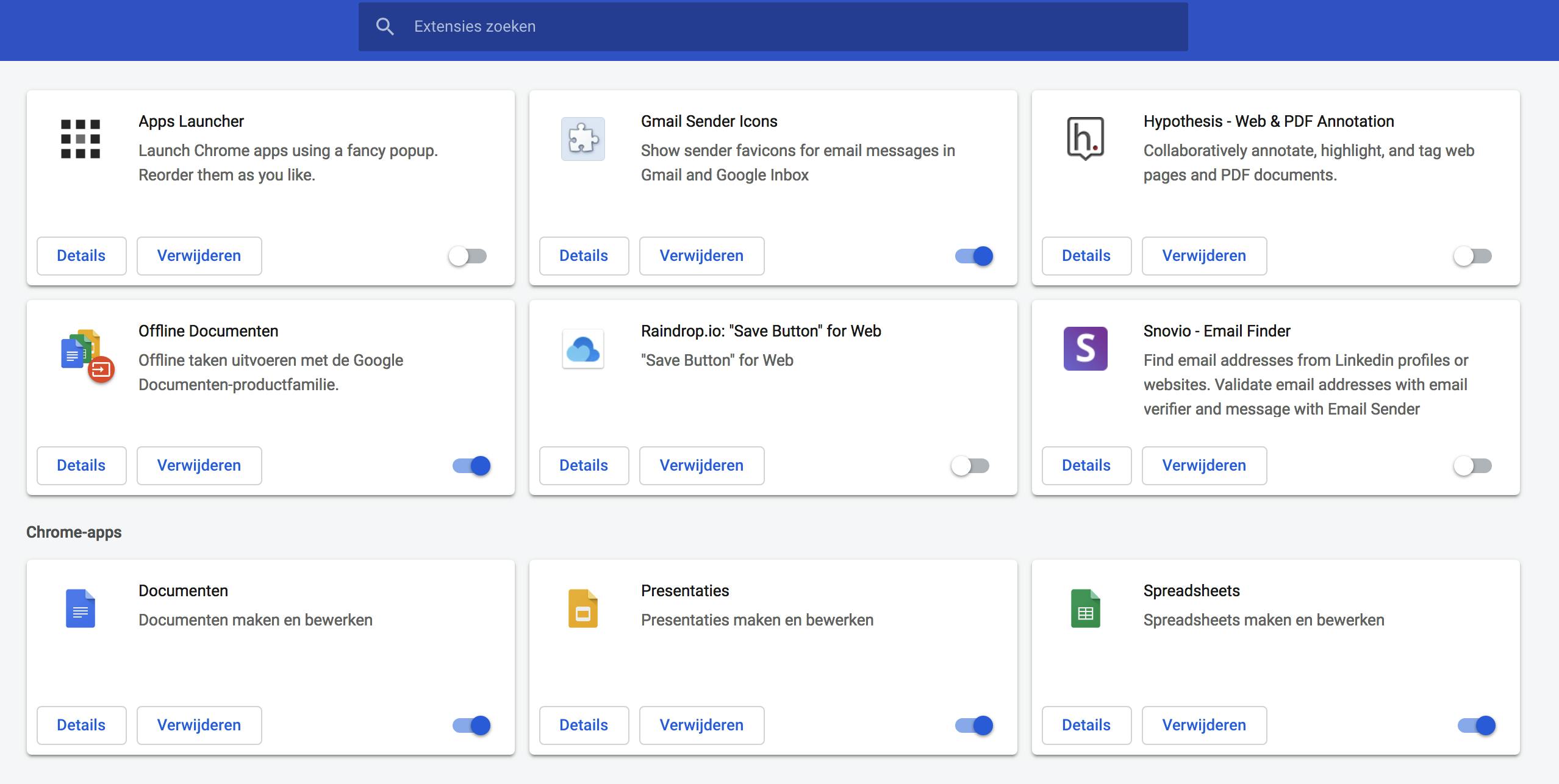 Gmail Sender Icons werkt volledig in de browser en stuurt geen informatie over jou of je mailgebruik naar derden. De Chrome-extensie maakt gebruik van de InboxSDK-bibliotheek om e-mail aan de kant van de client te analyseren. Net zoals bij alle andere extensies van Google Chrome, kun je deze toevoeging uitschakelen of verwijderen. Hiervoor ga je via het menu Venster naar Extensies. Dan krijg je een overzicht van alle extensies die je al hebt geïnstalleerd. Om een extensie (tijdelijk) uit te schakelen, gebruik je het blauwe schuifje. Wie de extensie echt zat is, maakt gebruik van de knop Verwijderen.