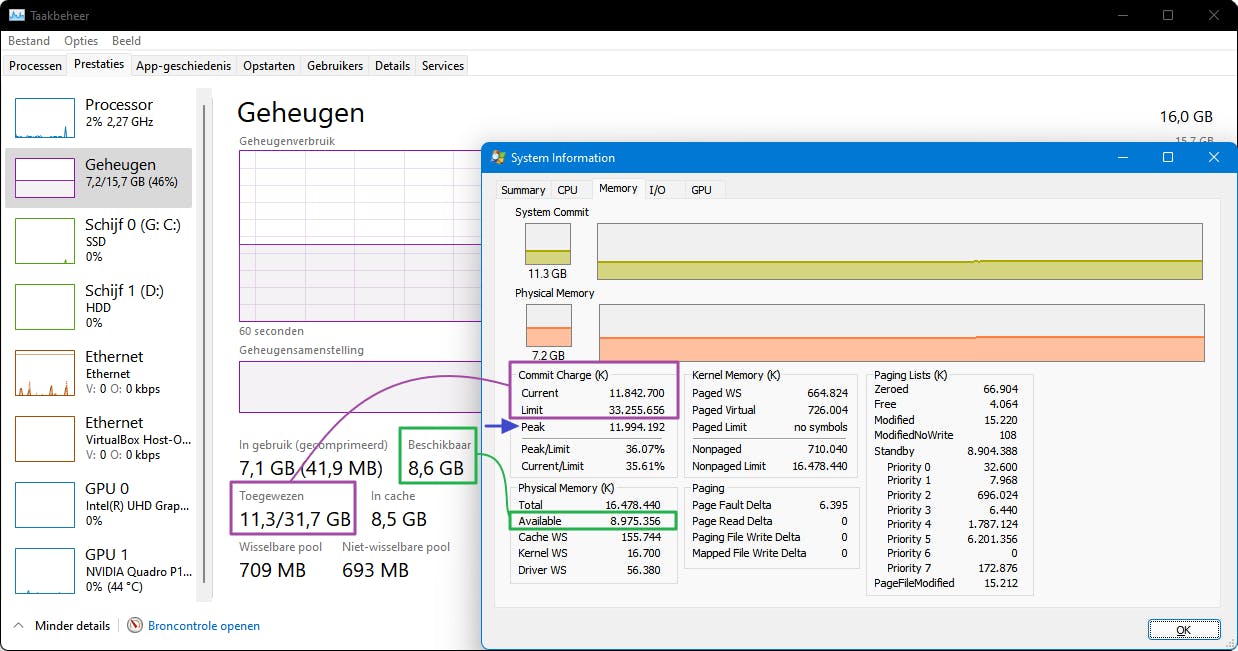 Tot slot vermelden we nog graag de gratis, portable tool Process Explorer, die nog informatiever is dan Windows Taakbeheer. Start de tool, druk op Ctrl+I en open het tabblad Memory. Interessant is hier ook de Peak-waarde: deze geeft het piekgebruik van het fysiek en virtueel geheugen aan die tijdens je huidige Windows-sessie werd gemeten.