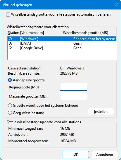 Zoals gezegd regelt Windows het (virtueel) geheugenbeheer prima zelf, maar beheer je dit toch liever zelf, ga dan naar het Instellingen-venster van Windows en klik achtereenvolgens op Systeem / Info / Geavanceerde systeeminstellingen. Op het tabblad Geavanceerd druk je op de bovenste knop Instellingen, waarna je nogmaals het tabblad Geavanceerd opent en op Wijzigen drukt. Om de grootte aan te kunnen passen, verwijder je het vinkje bij Wisselbestandsgrootte voor alle stations automatisch beheren, selecteer je Aangepaste grootte en vul je zelf waarden in bij de velden Begingrootte en Maximale grootte. Als begingrootte zou je eventueel het maximale (fysieke en virtuele) geheugen kunnen nemen, verminderd met de Peak-waarde (zie tip 2). Bevestig je keuze met Instellen.