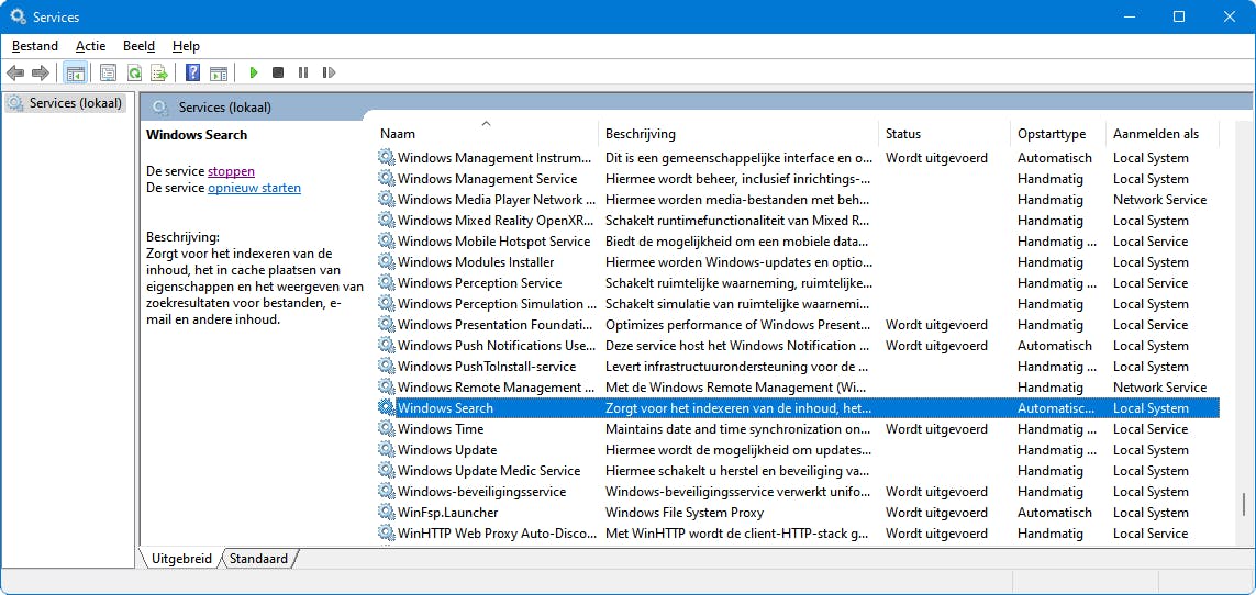 Ook services voor bestandsindexering voor zoekopdrachten kunnen veel systeembronnen gebruiken, vooral bij veel databestanden. Wat de zoekfunctie van Windows betreft, kun je zelf bepalen wat je wilt indexeren. Ga naar het Instellingen-venster van Windows, kies Privacy en beveiliging / Zoeken in Windows en klik op Zoeklocaties aanpassen. Je kunt de services ook tijdelijk stopzetten indien gewenst. Druk op Windows-toets+R, voer services.msc uit, scrol naar Windows Search, selecteer deze en klik linksboven op De service stoppen.
