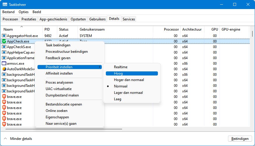 De meest voor de hand liggende manier om (tijdelijk) meer processorkracht te krijgen, is door het afsluiten van overtollige toepassingen, services en processen. Via Taakbeheer, op het tabblad Prestaties, krijg je in nagenoeg realtime een beeld van dit processorgebruik en via de grafiek GPU ook van je grafische processor(s). Het is in principe ook mogelijk het processorgebruik per applicatie te finetunen, hoewel je hier geen wonderen van hoeft te verwachten. Ga opnieuw naar Taakbeheer, open het tabblad Details, klik met rechts op een item en kies Prioriteit instellen, waar je bijvoorbeeld Hoger dan normaal of Hoog selecteert (de optie Realtime kies je veiligheidshalve beter niet). Je treft hier trouwens ook de optie Affiniteit instellen aan, waarbij je via vinkjes zelf kunt bepalen van hoeveel en welke processorkernen een toepassing mag gebruiken. Houd er wel rekening mee dat zulke aanpassingen alleen actief blijven tijdens je huidige Windows-sessie.