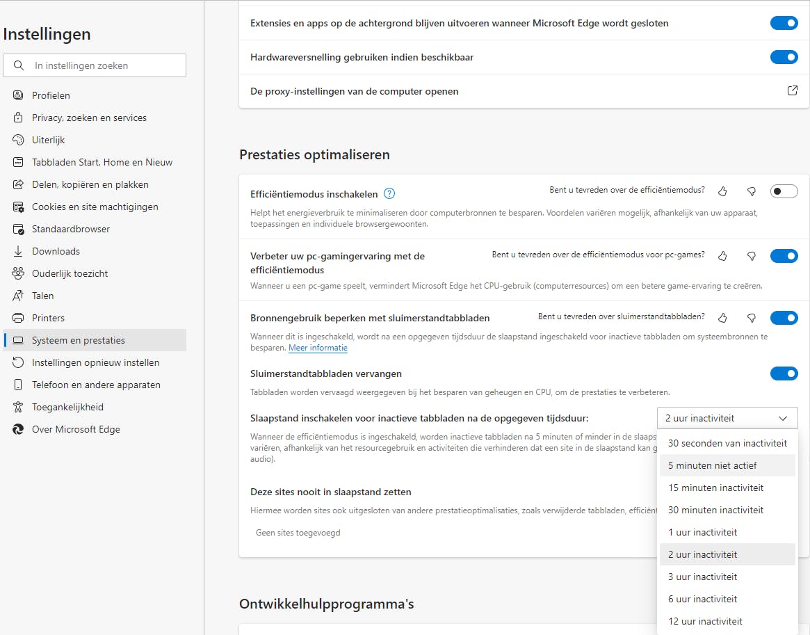 Een alternatief voor het zonder meer afsluiten, is het laten sluimeren van minder gebruikte tabbladen. In Edge gebeurt dit standaard na twee uur, maar je kunt dit zelfs tot 30 seconden reduceren: ga naar Instellingen / Systeem en prestaties, schakel Bronnengebruik beperken met sluimerstandtabbladen en Sluimerstandtabbladen vervagen in, en selecteer de gewenste time-out bij Slaapstand inschakelen voor inactieve tabbladen na de opgegeven tijdsduur. Of je laat dit aan de intelligentie van Edge over door de optie Efficiëntiemodus inschakelen te activeren.