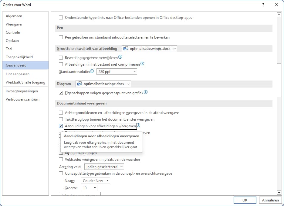 Het wordt wel wat spannender wanneer je erg grote tekstdocumenten, vooral met veel afbeeldingen of rekenbladen, inlaadt, hoewel je daar tijdens het eigenlijke bewerkingsproces wellicht niet zoveel hinder van zult ondervinden. Bij zwaar geïllustreerde tekstdocumenten kun je eventueel overwegen de afbeeldingenweergave (tijdelijk) uit te zetten. Dit kan in Word via Bestand / Opties / Geavanceerd, waar je onder het kopje Documentinhoud weergeven een vinkje plaatst bij de optie Aanduidingen voor afbeeldingen weergeven. In LibreOffice Writer doe je dit door het vinkje weg te halen bij Beeld / Afbeeldingen en diagrammen.