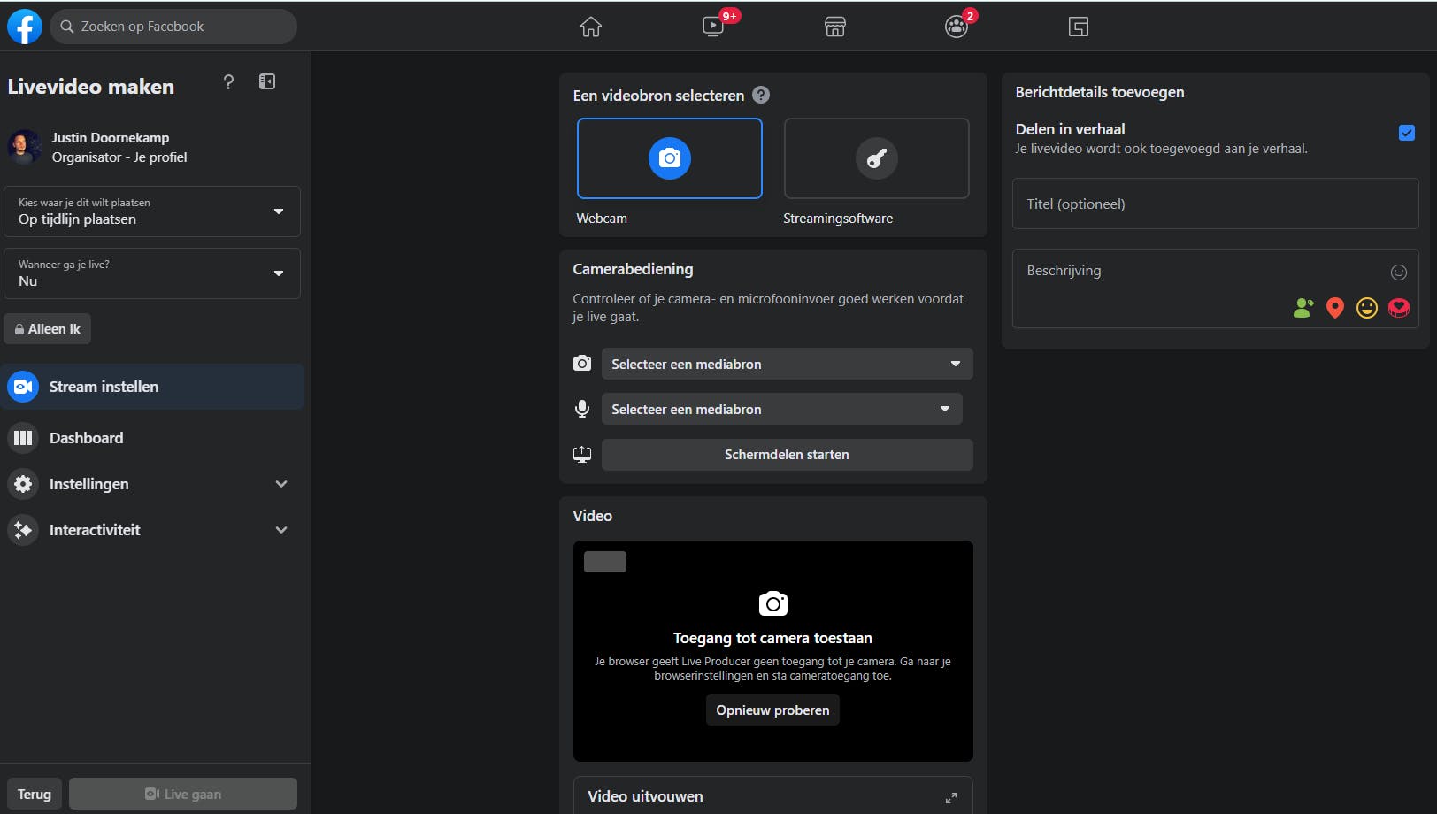 Rechts in het scherm bij Berichtdetails toevoegen geef je een titel voor je streamingsessie op, naast een beschrijving. In de menubalk aan de linkerkant van het scherm vind je nog wat extra opties. Hier kun je aangeven wie jouw livevideo mag bekijken en of je de video op je tijdlijn wilt vertonen. Heb je alles ingesteld? Klik dan op Live gaan.