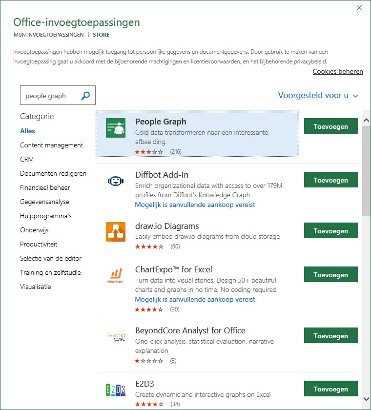 People Graph is een invoegtoepassing ontwikkeld door Microsoft zelf. De knop zit al in het Excel-lint, maar voordat je deze functie kunt gebruiken moet je aangeven dat je de invoegtoepassing vertrouwt. Zie je bij jou de knop niet, dan haal je die binnen via het tabblad Invoegen en vanaf daar ga je in de groep Invoegtoepassingen naar Invoegtoepassing downloaden. Zo kom je in de Store en typ je in het zoekvak People Graph. De juiste invoegtoepassing verschijnt bovenaan de resultatenlijst en daar klik je op knop Toepassen. Voortaan kun je dan de invoegtoepassing openen via de groene knop in de groep Invoegtoepassingen.