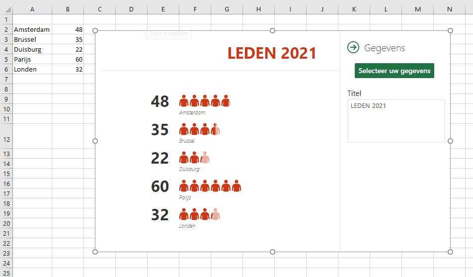 De eerste keer dat je op deze knop klikt, verschijnt er een zogeheten mensengrafiek op basis van fictieve gegevens. Als je op deze voorbeeldgrafiek klikt, zie je in de rechterbovenhoek twee knoppen. De eerste gebruik je om data te selecteren, de tweede om het uiterlijk van deze grafiek aan te passen. Als je op de eerste knop klikt, kun je trouwens ook de titel van de grafiek wijzigen, daarna gebruik je de groene knop Selecteer uw gegevens. Sleep simpelweg over de cellen die je aan de grafiek wilt toevoegen.