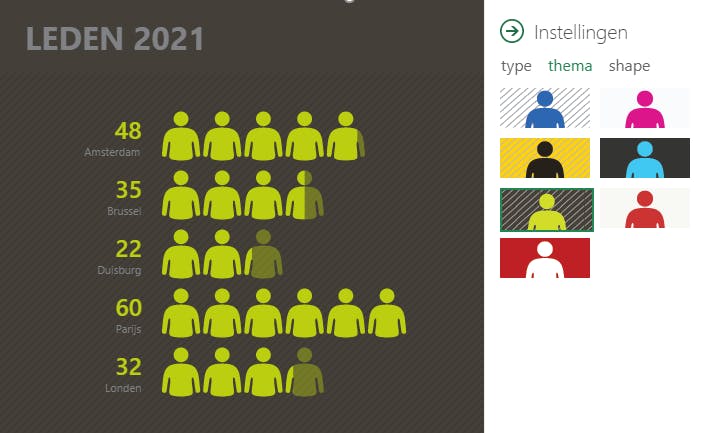 Met de tweede knop, het tandwieltje, wijzig je de looks van de grafiek. Je beschikt over drie tabbladen. In het tabblad Type kom je bij andere lay-outs die ieder hun eigen uitstraling hebben. Vind je het poppetje niet zo mooi dan gebruik je het tabblad Shape en daar staat een reeks nieuwe pictogrammen. Je kunt op die manier in plaats van poppetjes ook icoontjes van huizen, kleding, sterren, geld, enzovoort selecteren. Het tabblad Thema brengt je bij een combinatie van achtergronden met pictogrammen. Je kunt zo’n People Graph selecteren en slepen waar je maar wilt in de spreadsheet. Mooi is dat de grafiek automatisch wordt geüpdatet wanneer je de gegevens in de tabel wijzigt. Rechtsboven zie je trouwens ook een pijl in Windows of een info-pictogram in macOS. Daaronder vind je de functie Verwijderen voor het geval dat je de grafiek zou willen verwijderen.