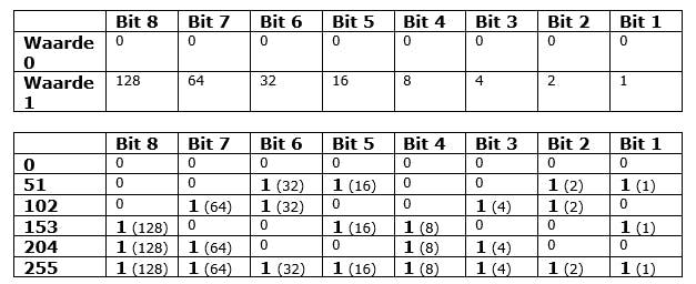Elke pixel van een digitale foto wordt neergezet door 3 bytes: 1 rood-byte, 1 groen-byte en 1 blauw-byte. Elke afzonderlijke byte kan een waarde tussen 0 en 255 bevatten. Dat komt omdat een byte gebruik maakt van het binaire talstelsel, waarbij we werken met nullen en enen. Daarbij bestaat 1 byte uit 8 bits. Die 8 bits kunnen afzonderlijk de waarde 0 of 1 bevatten. Als de bit op 0 staat, dan is de bijbehorende waarde ook 0. Als de bit op 1 staat, dan is de bijbehorende waarde afhankelijk van de bit-positie in de byte. De laagste (of eerste) bit is dan 1. De hoogste (of laatste) bit is dan 128. Kijk maar eens naar de onderstaande tabellen, dan zie je hoe dat in zijn werk gaat: