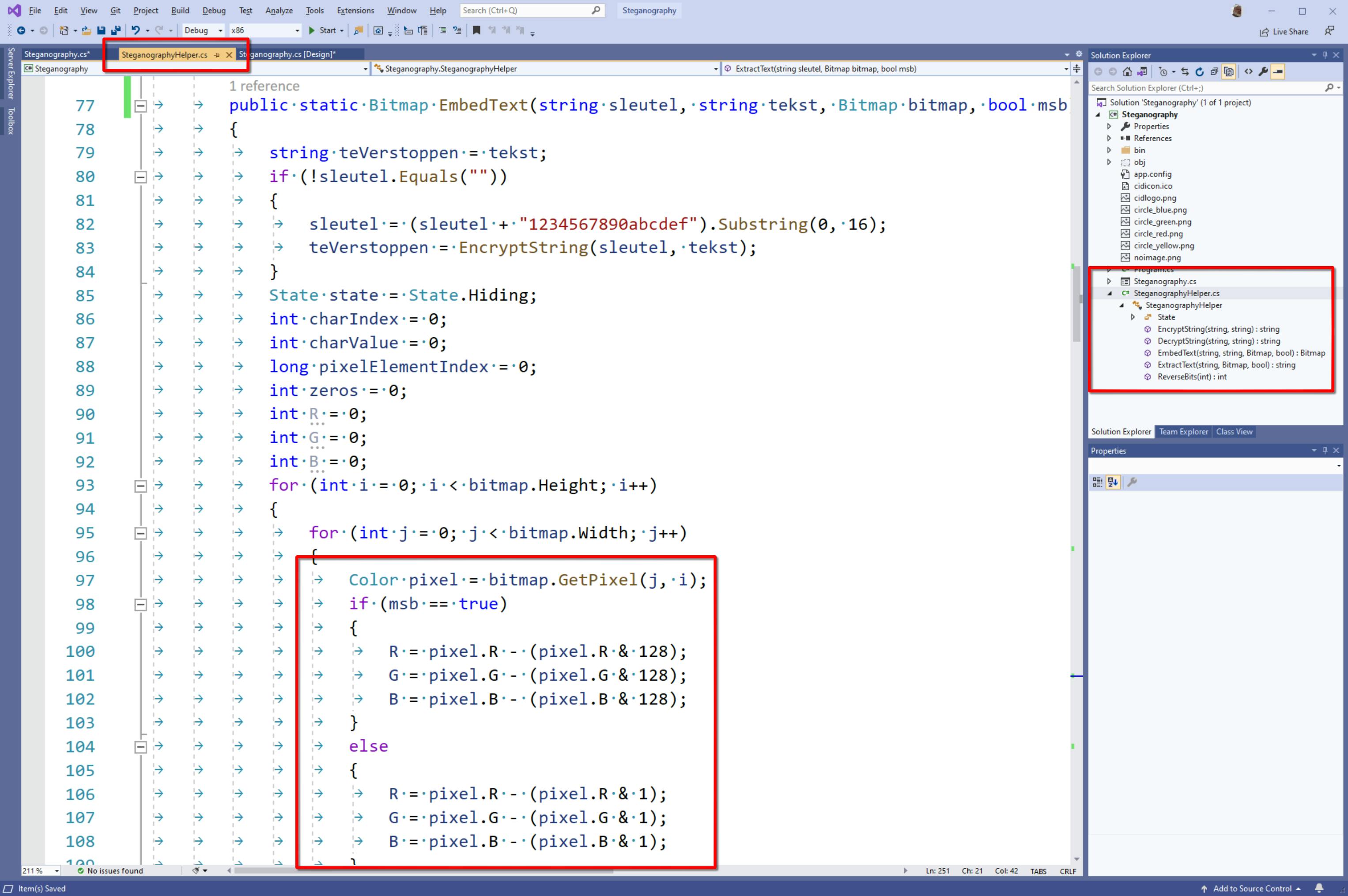 Tot slot willen we je nog even meenemen naar Visual Studio en wel om een stukje code te bekijken. Als je Steganography hebt laten draaien, dan is het WinForms-project al geopend. Rechts in beeld vind je de zogeheten Solution Explorer en de C#-programmacode waar het om draait bevindt zich in het bestand SteganographyHelper.cs. Daarbij gaat het feitelijk om vier functies: