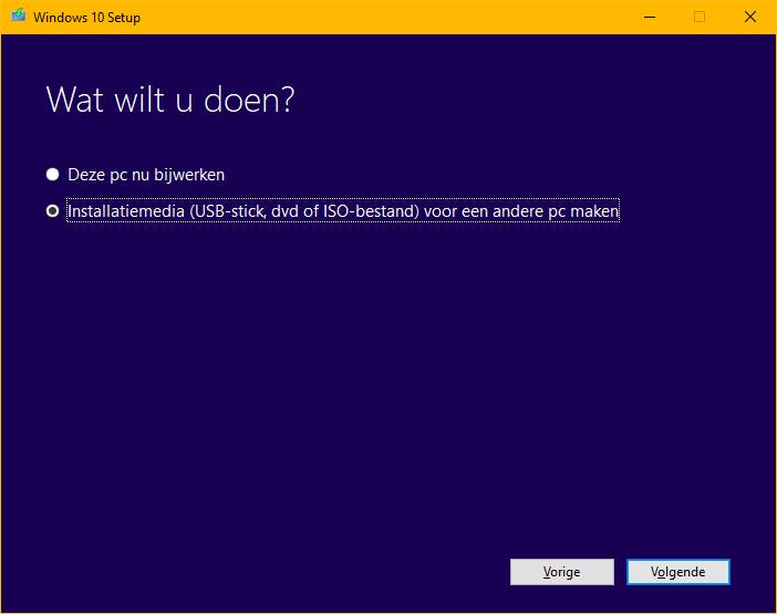 Een usb-stick is een perfect medium om Windows mee te installeren en gelukkig is zo’n stick ook heel eenvoudig om te maken. Het installeren van Windows via een zelfgemaakte usb-stick is niet verboden. Sterker nog, Microsoft heeft zelfs een programma gemaakt waarmee je zo’n stick heel eenvoudig in elkaar draait, genaamd de Media Creation Tool. Om dit programma te downloaden, klik je op Hulpprogramma nu downloaden. Het bestand MediaCreationTool.exe wordt geopend en zodra je dit start, moet je eerst de voorwaarden accepteren. Klik vervolgens op Installatiemedia voor een andere pc maken en daarna op twee keer op Volgende. Kies voor USB-flashstation en zorg ervoor dat je een usb-stick van tenminste 8 GB hebt. Klik op Volgende. Selecteer de gewenste usb-stick en klik op Volgende. De meest recente versie van Windows 10 wordt nu gedownload, waarna de stick wordt geformatteerd en het installatiebestand van Windows op de stick wordt geplaatst. Je kunt deze usb-stick nu gebruiken om Windows te installeren op een pc, zelfs als Windows volledig gecrasht is en niet meer wil opstarten.