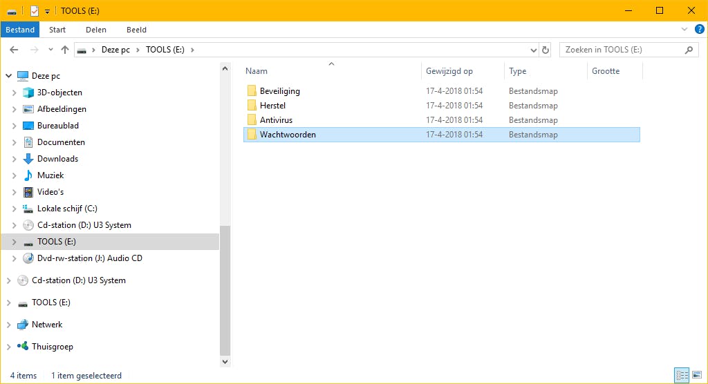 We gaven het al eerder even aan: wanneer je een verzameling programma’s maakt voor het oplossen van problemen, is het wel zo verstandig om ervoor te zorgen dat je snel kunt vinden wat je zoekt. Programma’s die een eigen usb-stick nodig hebben kun je labelen, maar wanneer je heel veel programma’s op een stick gaat zetten, is het belangrijk dat je ook die indeling goed ordent. Kortom: maak duidelijke mapnamen die aangeven waar je welk type programma kunt vinden op de usb-stick. Dat is even een gedoe, maar je zult jezelf dankbaar zijn op het moment dat je een programma nodig hebt.