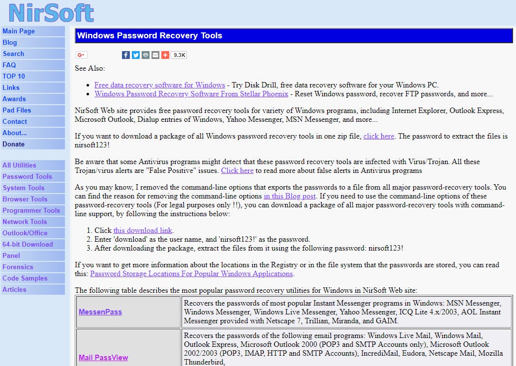 Een wachtwoord kwijtraken is niet handig, zeker niet als het gaat om een wachtwoord voor iets belangrijks, zoals een router of Outlook. De ontwikkelaar van NirSoft, genaamd Nir Sofer, heeft zich onder meer gespecialiseerd in het maken van programma’s voor het achterhalen van wachtwoorden. Hier vind je een zeer groot overzicht van allerlei programma’s die ieder voor een andere functie geschreven zijn. Het is dus niet één pakket waarmee je allerlei wachtwoorden in één keer kunt achterhalen, je zult echt voor elk onderdeel een afzonderlijk tooltje moeten downloaden. Problematisch is dat niet, want al deze programma’s zijn draagbaar én klein, wat betekent dat je ze gewoon allemaal op je usb-stick kunt plaatsen en kunt gebruiken wanneer je ze nodig hebt. Deze site draait echt al heel erg lang mee en bevat oplossingen voor zowel oude als nieuwe programma’s.