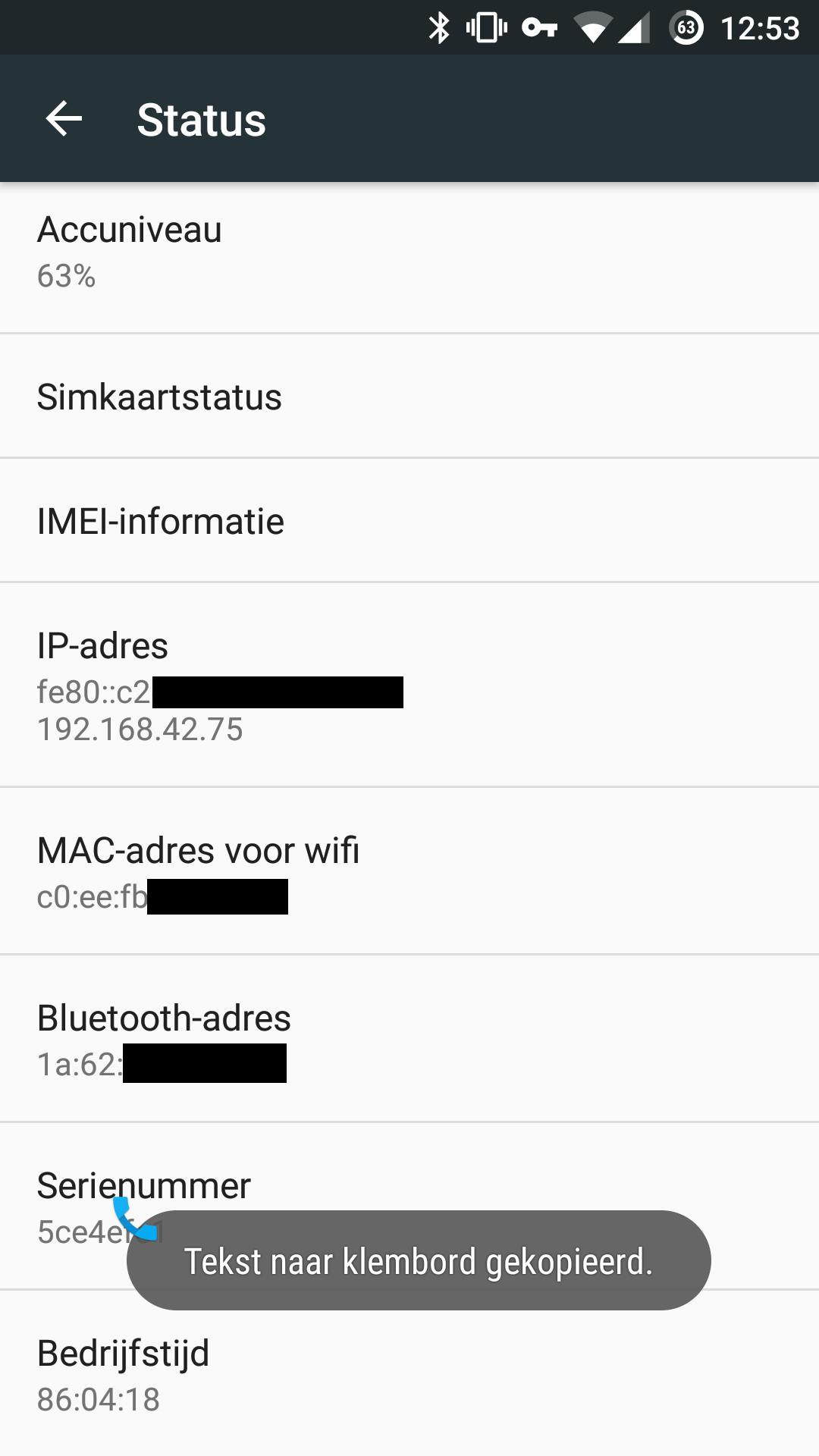 Je ziet daar twee opties staan: 'MAC-adres voor wifi' en 'Bluetooth-adres'. Als je die lang ingedrukt houdt, kopieer je de gegevens automatisch naar je Klembord zodat je ze meteen kunt plakken in je browser.
