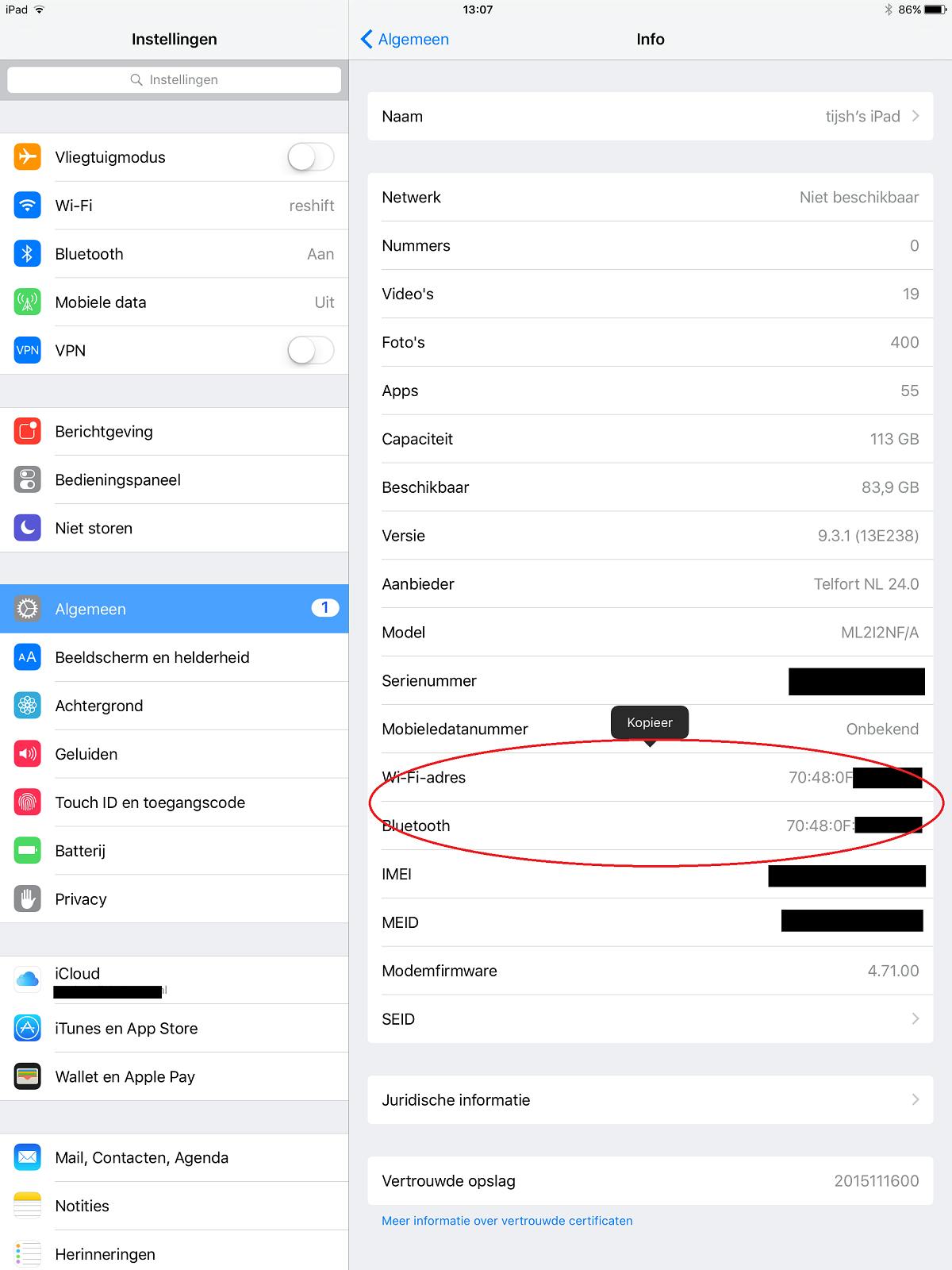 Ga naar 'Instellingen', en tik onder 'Algemeen' op 'Info'. Daar staat informatie over je toestel, waaronder het MAC-adres en bluetooth-adres. Ook op iOS kopieer je dit door het vakje ingedrukt te houden.