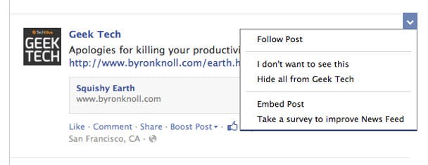 Om een post te blokkeren die in je nieuwsoverzicht verschijnt, klik dan op het omlaag wijzende pijltje in de rechterbovenhoek, en selecteer Ik wil dit niet zien in het menu. Dan verbergt Facebook de post. Als je van een bepaalde persoon of pagina helemaal niets in je nieuwsoverzicht wilt hebben, selecteer dan Alles van [naam] verbergen.