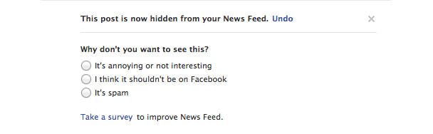 Wanneer je een post verbergt, vraagt Facebook of je alles van die persoon of pagina wilt verbergen, en soms krijg je opties om een post aan Facebook te rapporteren. Facebook biedt de volgende opties: 'Het is irritant of oninteressant', 'Ik vind dat dit niet op Facebook thuishoort', of 'Het is spam'. Selecteer de meest toepasselijke optie, en Facebook doet de rest. Je kunt je actie ook ongedaan maken, voor het geval je iets per ongeluk geblokkeerd hebt of je van gedachten veranderd bent.