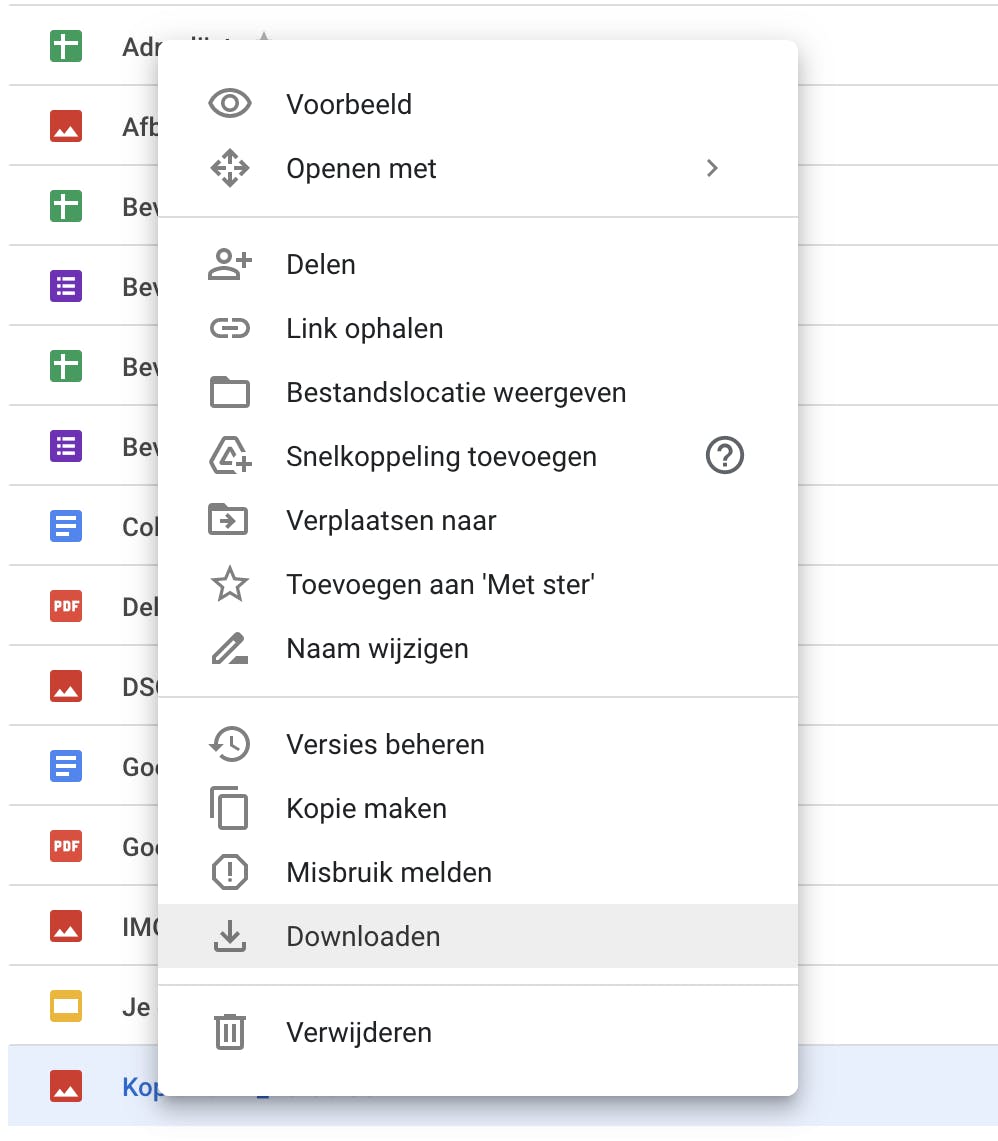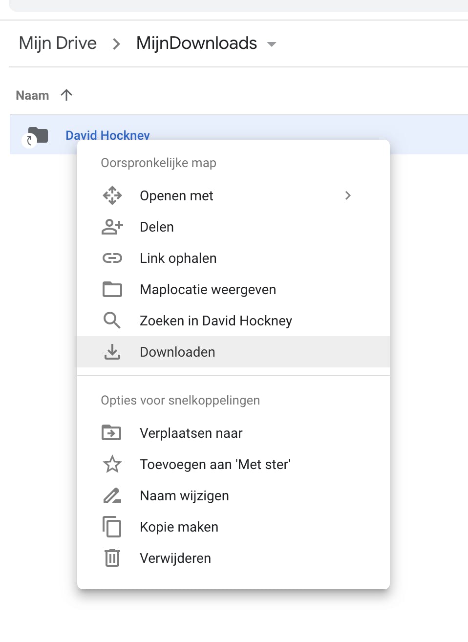 Ga nu naar je eigen persoonlijke Google Drive en creëer in Mijn Drive een nieuwe map. Geef deze map een naam. In dit voorbeeld noemen we die MijnDownloads. Scrol vervolgens in de linkerkolom naar beneden, zodat je Met ster kunt selecteren. Daar vind je het zojuist gemarkeerde item dat je wilt downloaden. Selecteer het en klik erop met de rechtermuisknop. In het menu kies je voor Snelkoppeling toevoegen. Onmiddellijk verschijnt er een pop-up waarin je aangeeft waar je de snelkoppeling wilt plaatsen. Selecteer Mijn Drive en kies je de map die je daarnet hebt aangemaakt. Klik vervolgens op Snelkoppeling toevoegen. Zodra de snelkoppeling is geplaatst, ga je terug naar Mijn Drive. Klik daarin met de rechtermuisknop op de snelkoppeling en kies Downloaden. Je leest dat de download wordt voorbereid en even later krijg je het bericht dat de download klaarstaat.