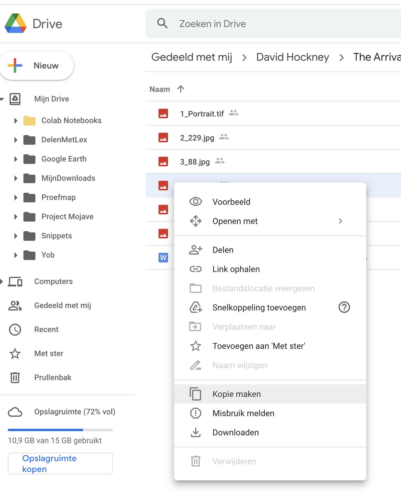 Als de Google-filters het downloaden ervan hebben verhinderd, kun je zelf dit gedeelde bestand ook niet meer binnenhalen. Maar de blokkade van Google geldt alleen voor dat specifieke bestand en niet voor de rest van je Google Drive-account. Dit betekent dat je andere bestanden nog steeds kunt downloaden. De oplossing is dus bijzonder eenvoudig: maak een kopie van het geblokkeerde bestand. Klik er met de rechtermuisknop op en selecteer Een kopie maken. Er wordt een nieuw bestand aangemaakt, met de toevoeging Een kopie van voor de oorspronkelijke naam. Dit bestand kun je dan gewoon weer downloaden.