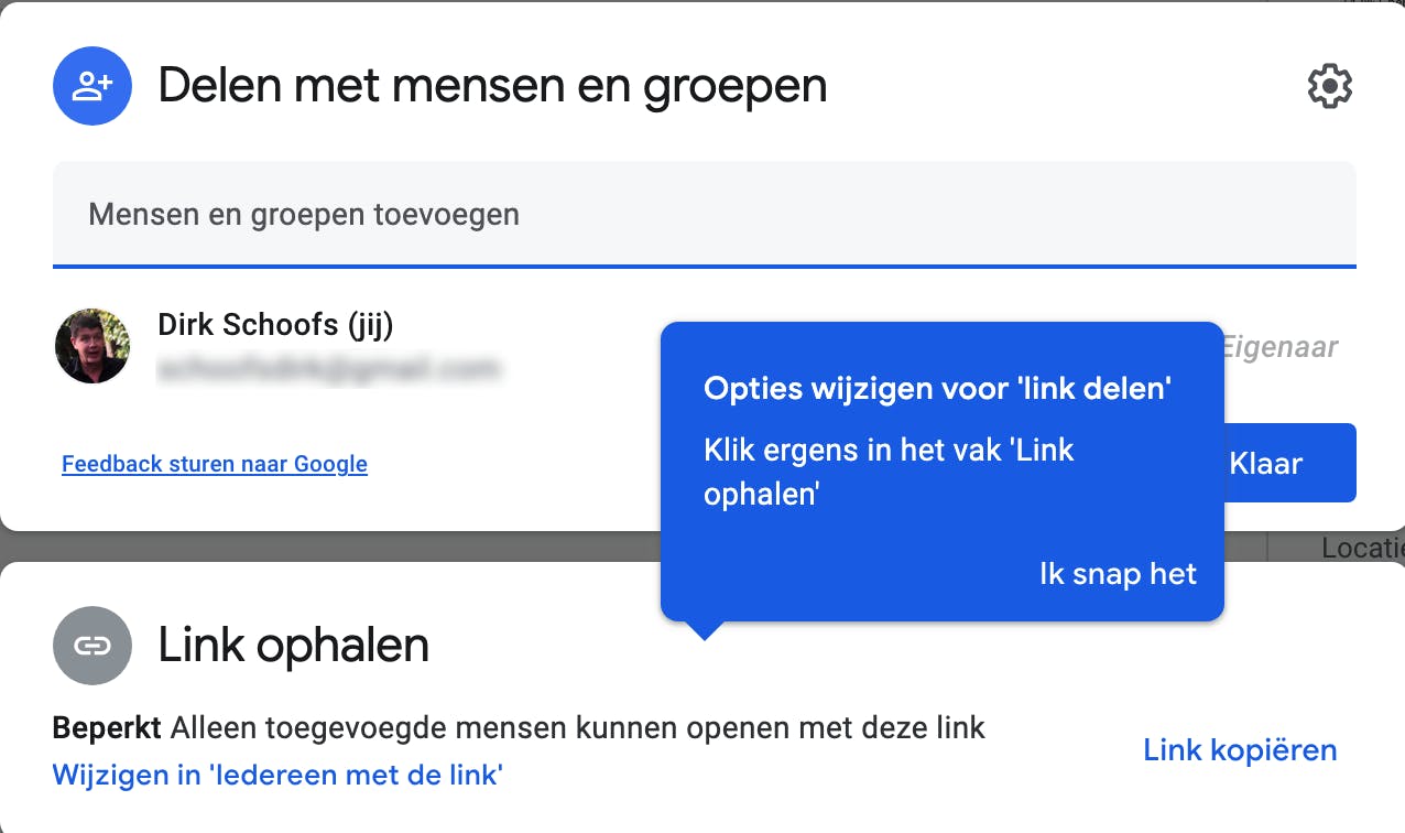 Wanneer je via een webpagina of sociale media naar downloads op je Google Drive verwijst, zet je de deur open voor massa-downloads. Om te vermijden dat veel te veel gebruikers zich in een korte tijd op een bepaald bestand storten, kan het de moeite waard zijn om in te stellen dat slechts een select aantal mensen het bestand mogen downloaden. Klik hiervoor met de rechtermuisknop op het bestand en selecteer Delen. Als je mensen via een internetlink toegang hebt gegeven tot het bestand, selecteer je Wijzigen in het gedeelte Link ophalen. In de vervolgkeuzelijst om de instellingen te wijzigen, kies je Beperkt. Dit betekent dat alleen mensen met wie je het bestand rechtstreeks hebt gedeeld, het kunnen openen of downloaden. Daarna voeg je alle e-mailadressen of groepen toe die je toegang wilt verlenen.