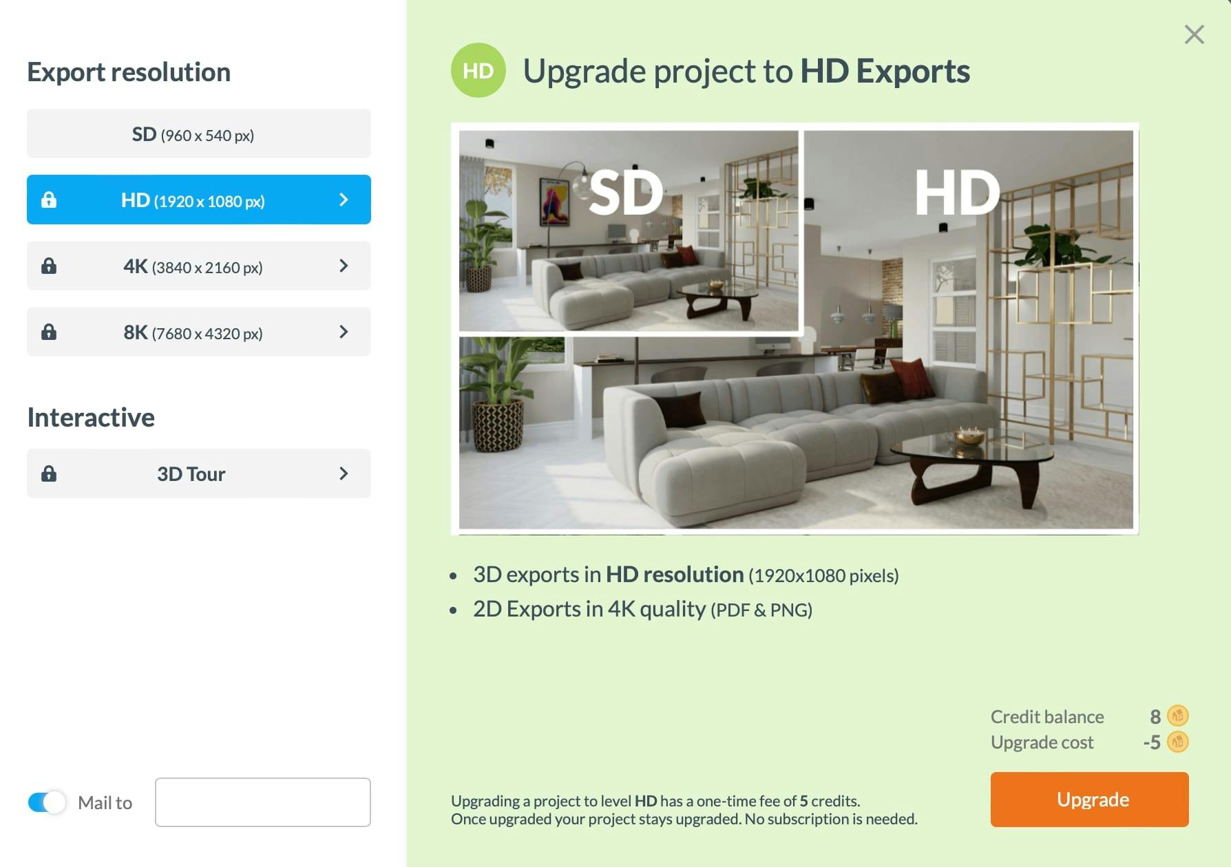 Een versie met lage resolutie en het watermerk van Floorplanner is gratis, wil je een hogere resolutie zonder watermerk, dan moet je credits kopen. Ook voor projecten met meerdere verdiepingen zijn credits nodig. Je kunt eenmalig credits kopen à 1,44 euro per credit, een bedrag wat in het niet valt bij eventuele inrichtings- en verbouwingskosten.