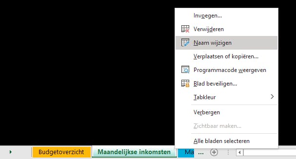 Iedere werkmap in Excel bestaat uit één of meerdere werkbladen. Wanneer je met een grote hoeveelheid gegevens werkt, kun je ze het best in verschillende werkbladen van dezelfde werkmap onderbrengen. Op die manier houd je alle gegevens samen, terwijl de verschillende datagroepen toch overzichtelijk verdeeld zijn. Maak je diverse werkbladen aan, dan zal Excel ze als volgt nummeren: Blad 1, Blad 2, Blad 3, ... Maar om ze beter te kunnen beheren, kun is het verstandiger ze een onderscheidende naam te geven. Dat kunnen jaartallen, steden of maanden zijn, zolang de naam maar aangeeft wat er precies in het werkblad staat. Houd er rekening mee dat elk werkblad een unieke naam moet hebben. Klik met de rechtermuisknop op de bladtab die je wilt hernoemen en selecteer Naam wijzigen. Typ de gewenste naam en klik daarna ergens buiten het werkblad. Je kunt ook dubbelklikken op een bladtab om de naam te wijzigen.