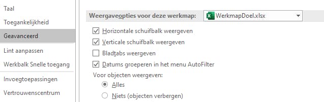 Ontvang je van iemand een Excel-bestand, maar zie je geen werkbladtabs, dan is de optie Bladtabs weergeven voor dit document hoogstwaarschijnlijk uitgeschakeld. Ga naar Bestand / Opties / Geavanceerd. Controleer onder Weergaveopties voor deze werkmap of het selectievakje bij Bladtabs weergeven is ingeschakeld.