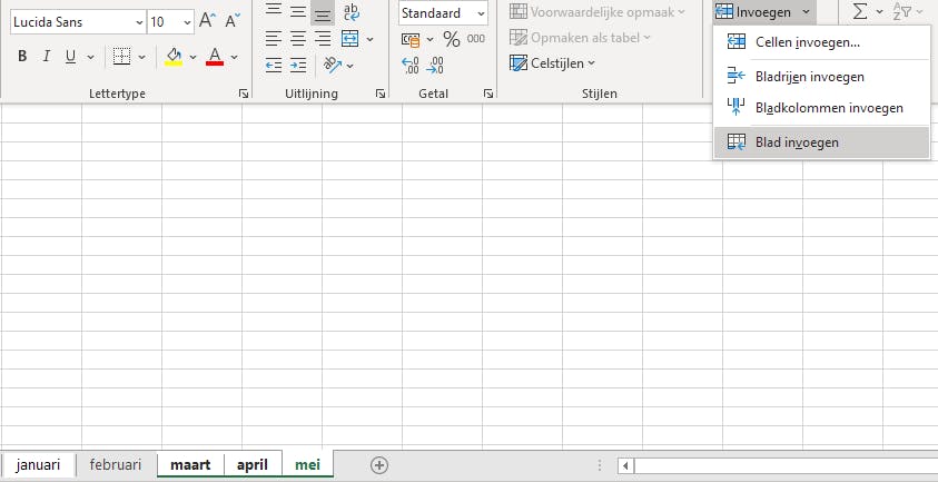 Naast de tabs van de werkbladen vind je een knop met een plusteken. Dit is de knop waarmee je een nieuw werkblad maakt. Je kunt ook in het lint naar het tabblad Start gaan. Daar kies je in de groep Cellen de opdracht Invoegen / Blad invoegen. Om een werkblad te verwijderen, klik je met de rechtermuisknop op de bladtab en kies je Verwijderen. Of je gaat opnieuw naar het tabblad Start waar je Verwijderen / Blad verwijderen selecteert.